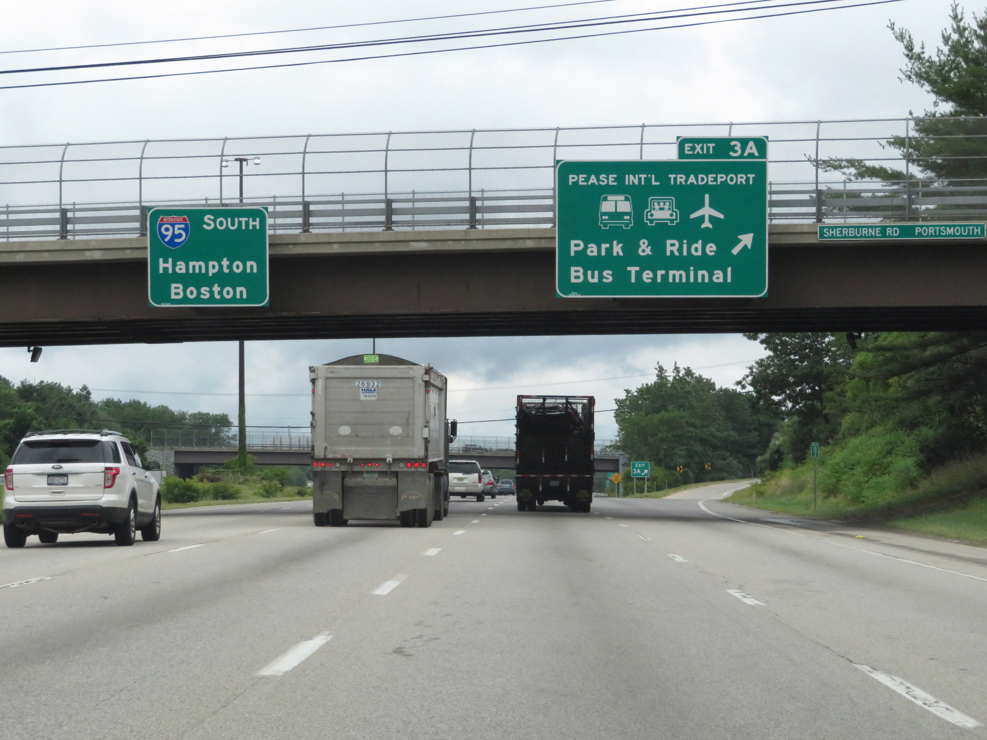 Interstate 95 South at Exit 3A: Pease International Tradeport / Park & Rid / Bus Terminal (Photo taken 8/8/17). |
