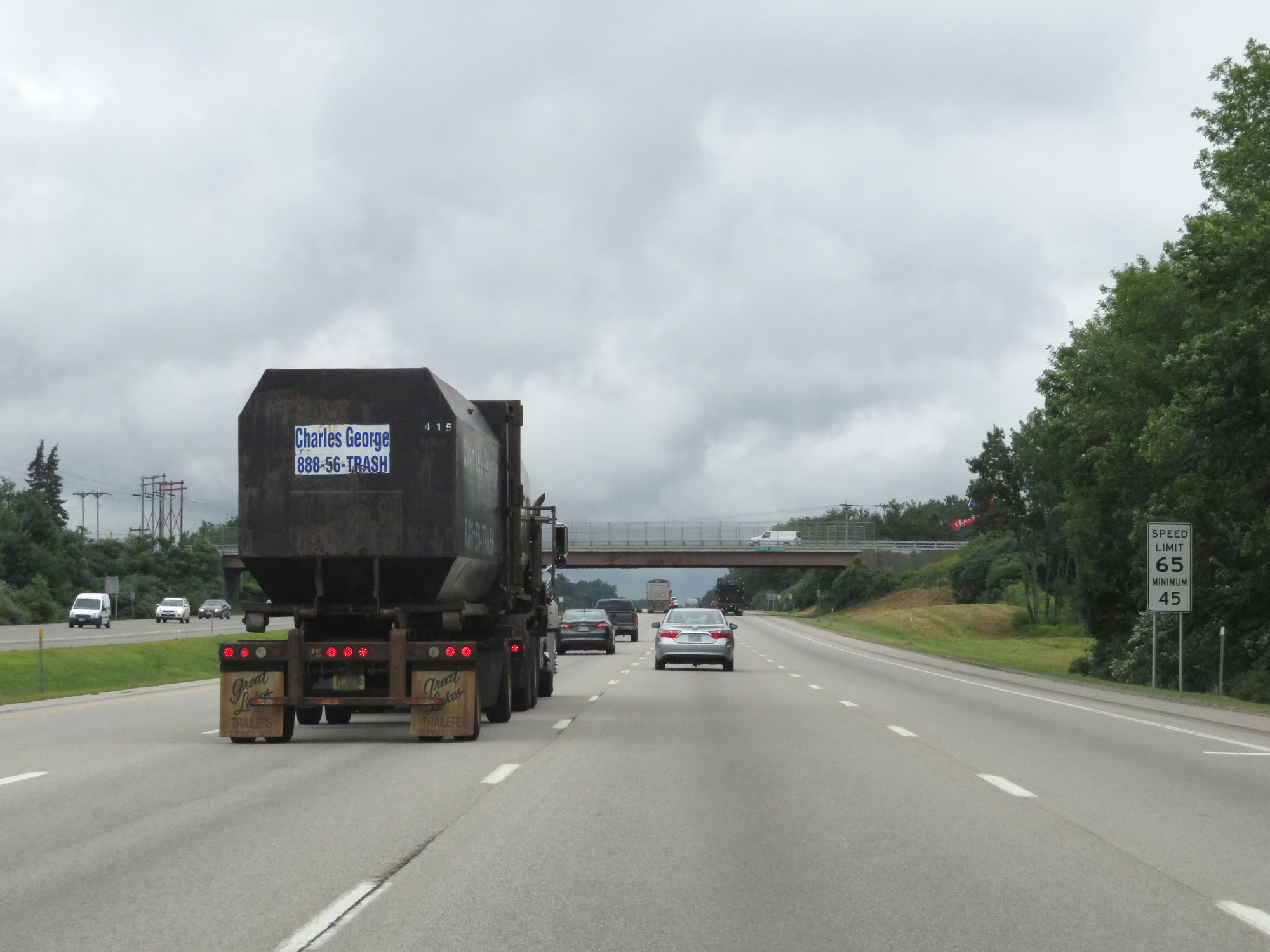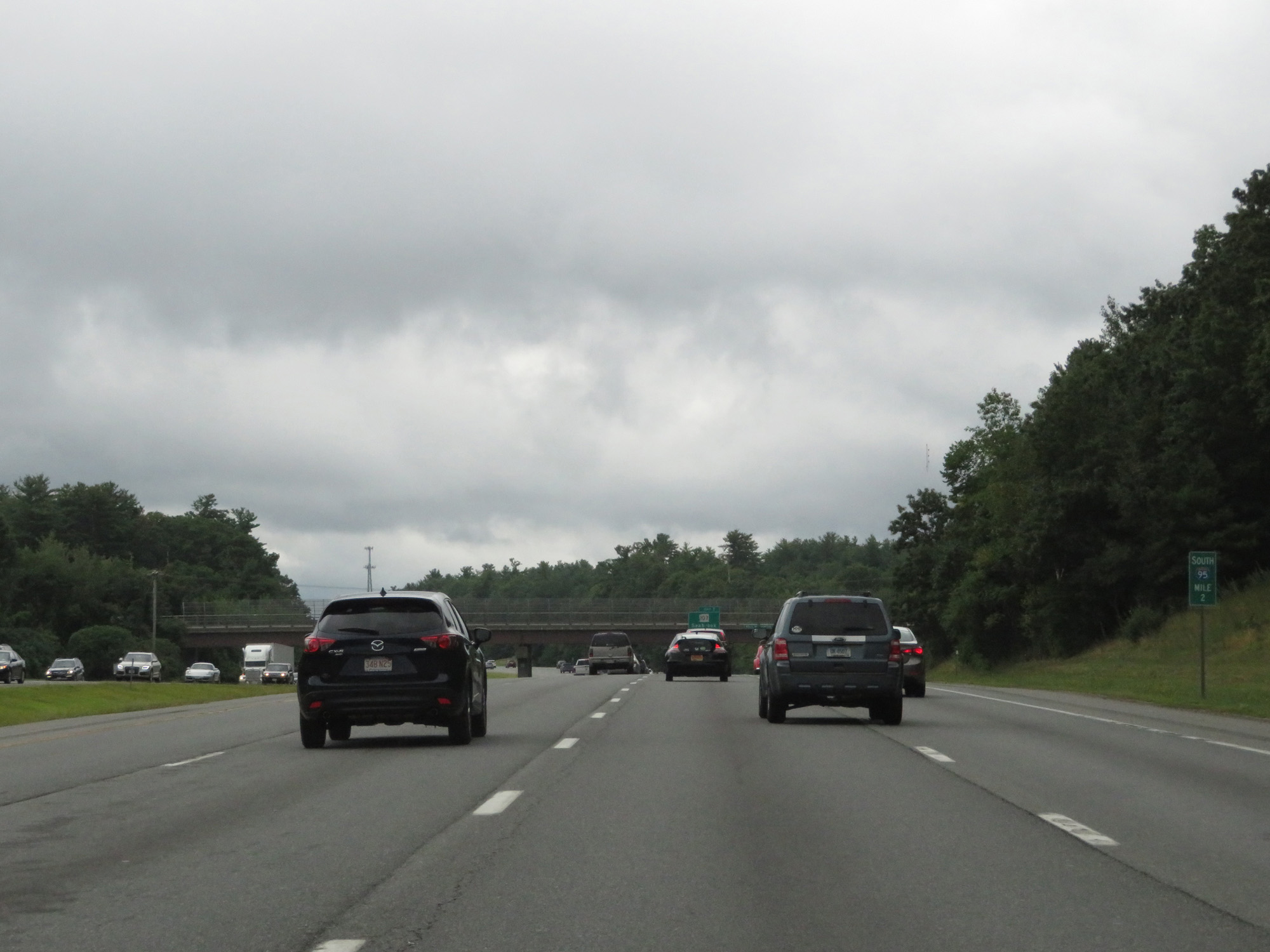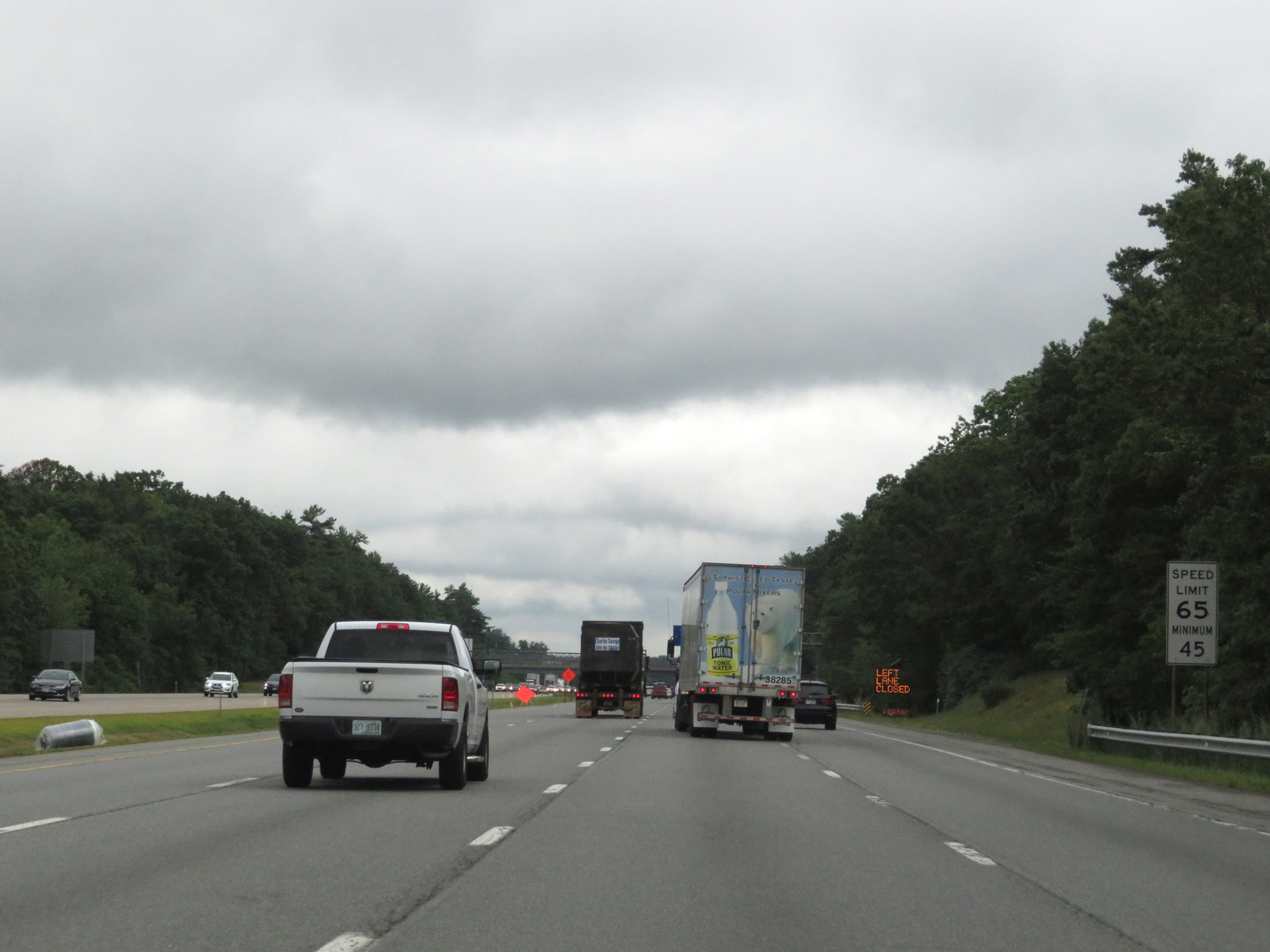 Just south of mile marker 12, the speed limit increases to 65 mph with a minimum speed limit of 45 mph. These are the standard speed limits on most (but not all) rural Interstate highways in New Hampshire. (Photo taken 8/8/17). |