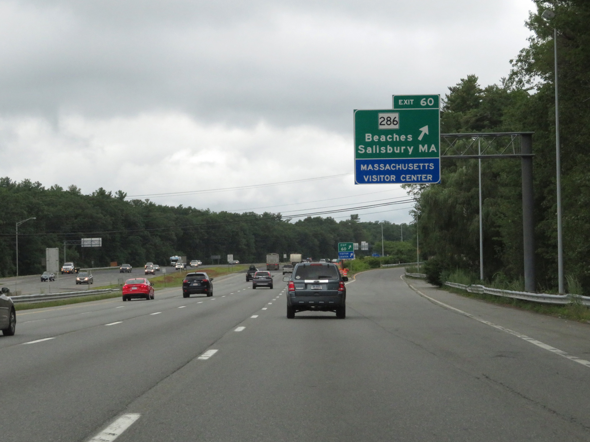 Interstate 95 South at Exit 60: MA 286 - Beaches / Salisbury, MA. This exit ramp is still located in New Hampshire, with the Massachusetts state line just ahead beyond it. (Photo taken 8/8/17). |