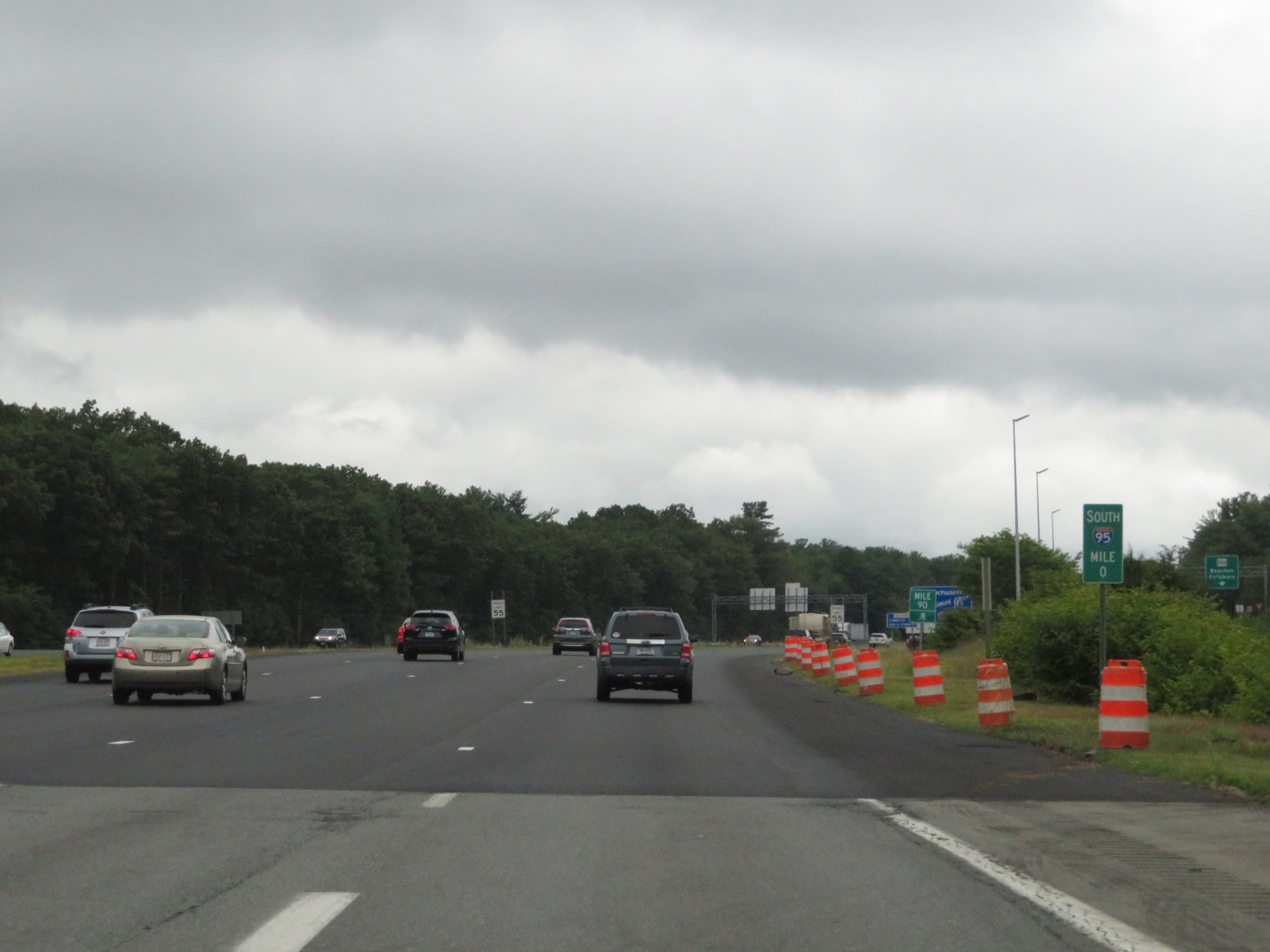 Interstate 95 South as it crosses the border into Massachusetts, noted here by mile marker 0. (Photo taken 8/8/17). |