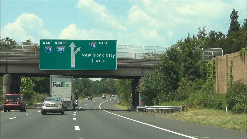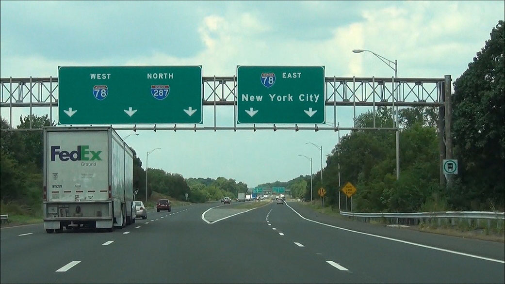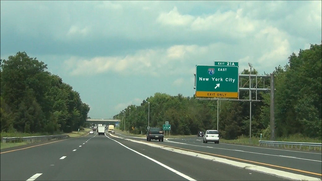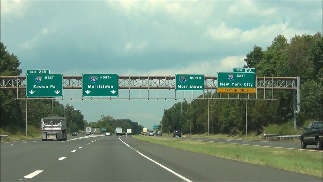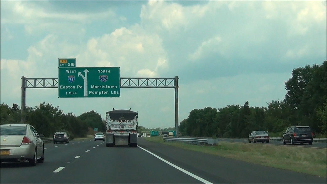 Interstate 287 North at Exit 21A: Interstate 78 East - New York City. This is why the signs for I-78 East directed you into the local lanes about 1 1/2 miles back. You can't get to this exit without getting in the local lanes back at that point, as you can see. (Photo taken 7/24/12). |