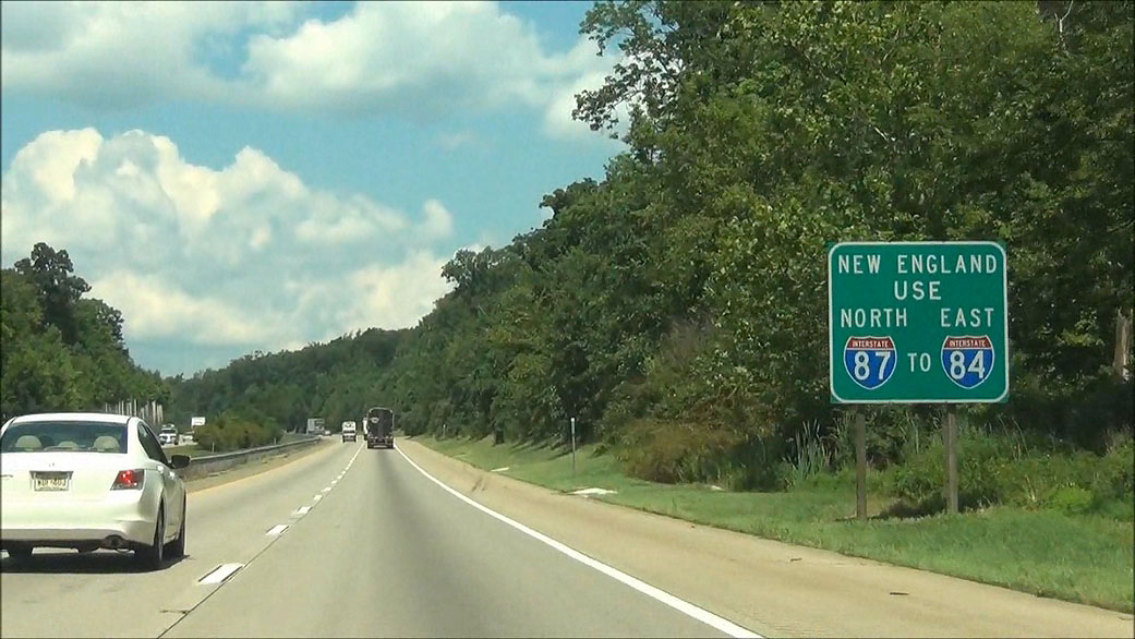 Sign near mile marker 64.7, indicating that motorists should use Interstate 87 North to Interstate 84 East to the New England states. (Photo taken 7/24/12). |