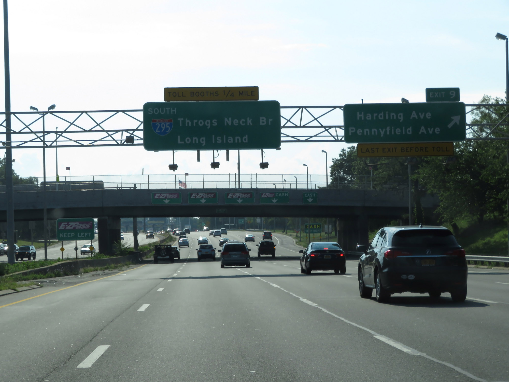 Interstate 295 South as it approaches the toll plaza for the Throgs Neck Bridge, on the north side of the East River. (Photo taken 8/20/16). |