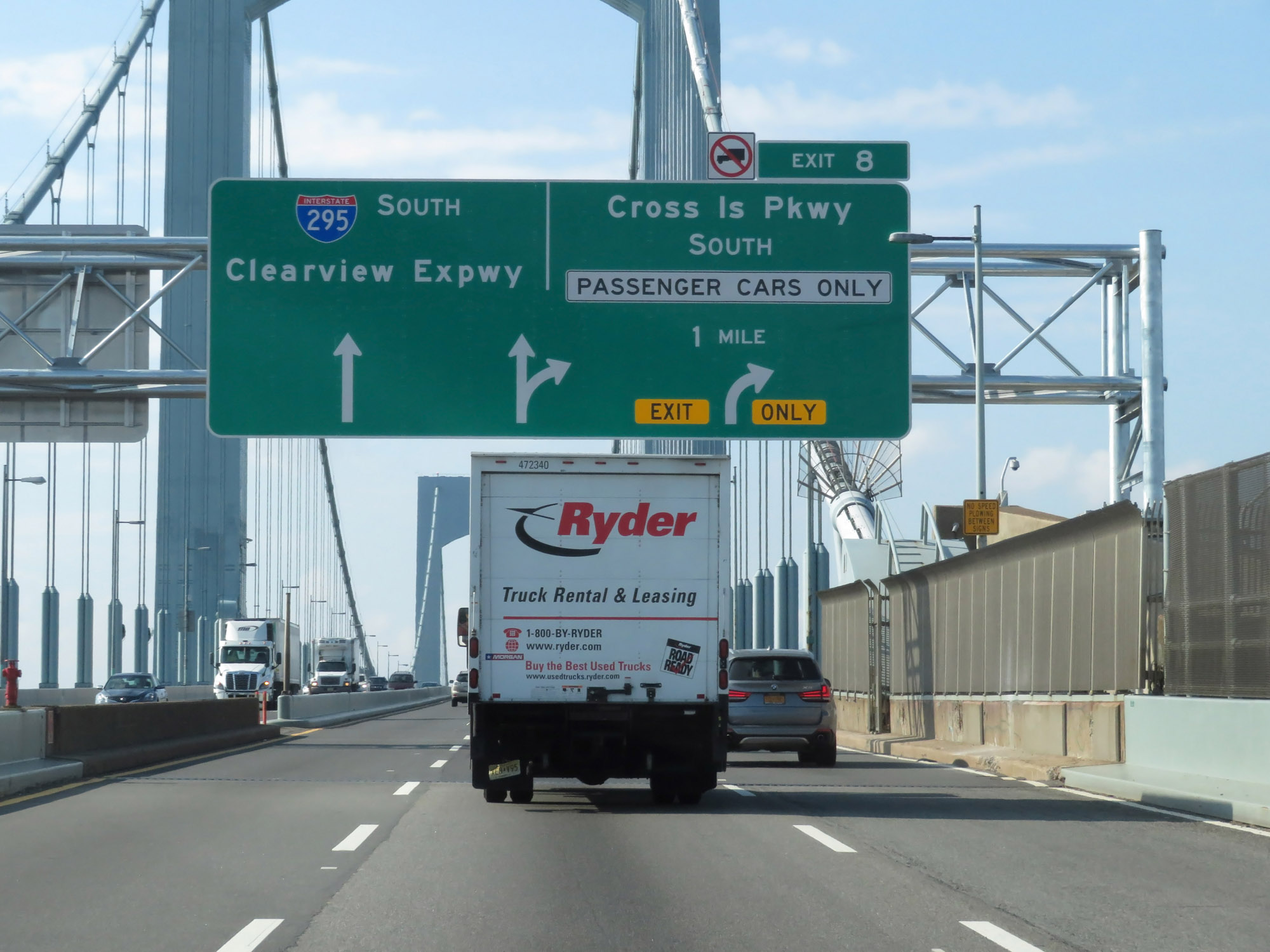 Advance signage for Exit 8 on Interstate 295 South as it nears the peak of the Throgs Neck Bridge. (Photo taken 8/20/16). |
