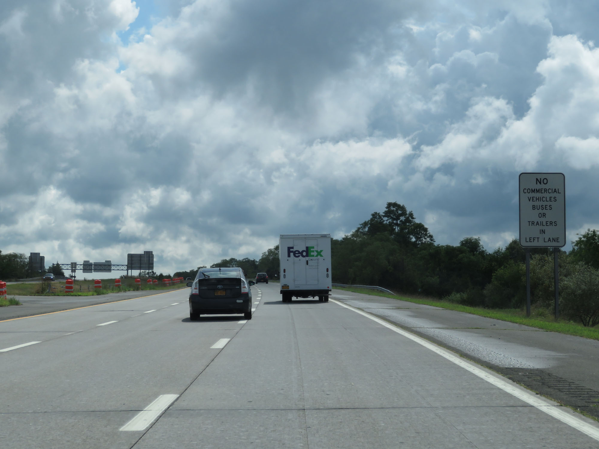 As Interstate 495 West (Long Island Expressway) starts out at 3 lanes in each direction, this sign states that commercial vehicles and buses are prohibited in the leftmost lane. (Photo taken 8/20/16). |