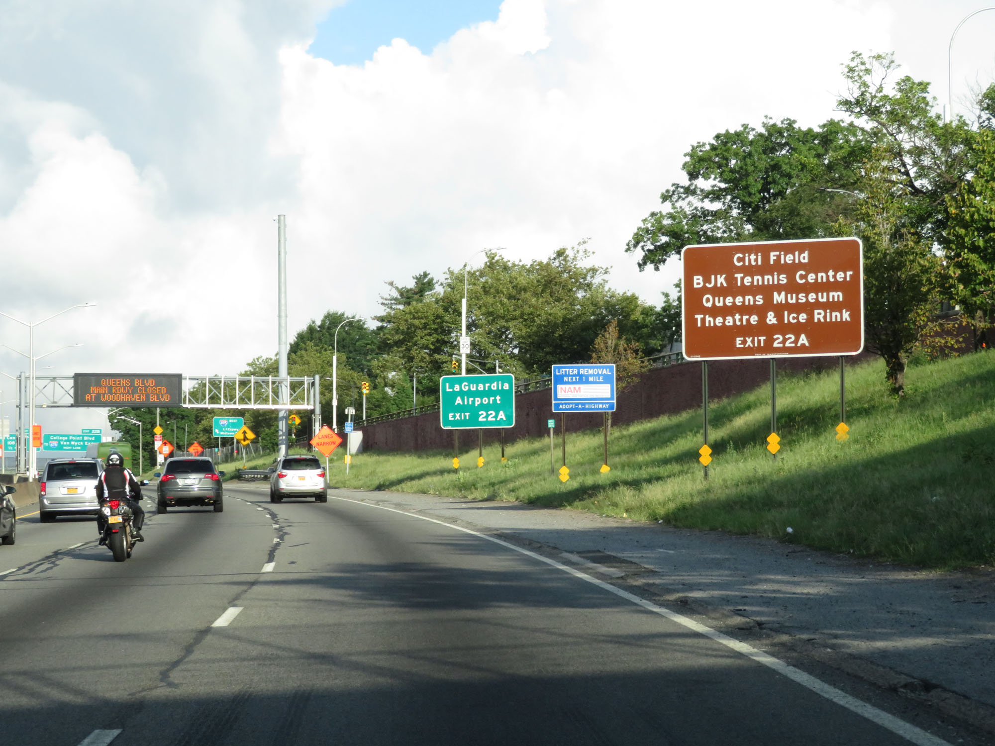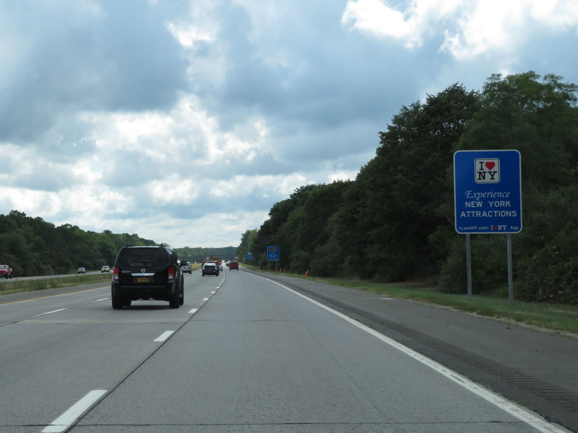 New York tourism sign on Interstate 495 West (Long Island Expressway). (Photo taken 8/20/16). |