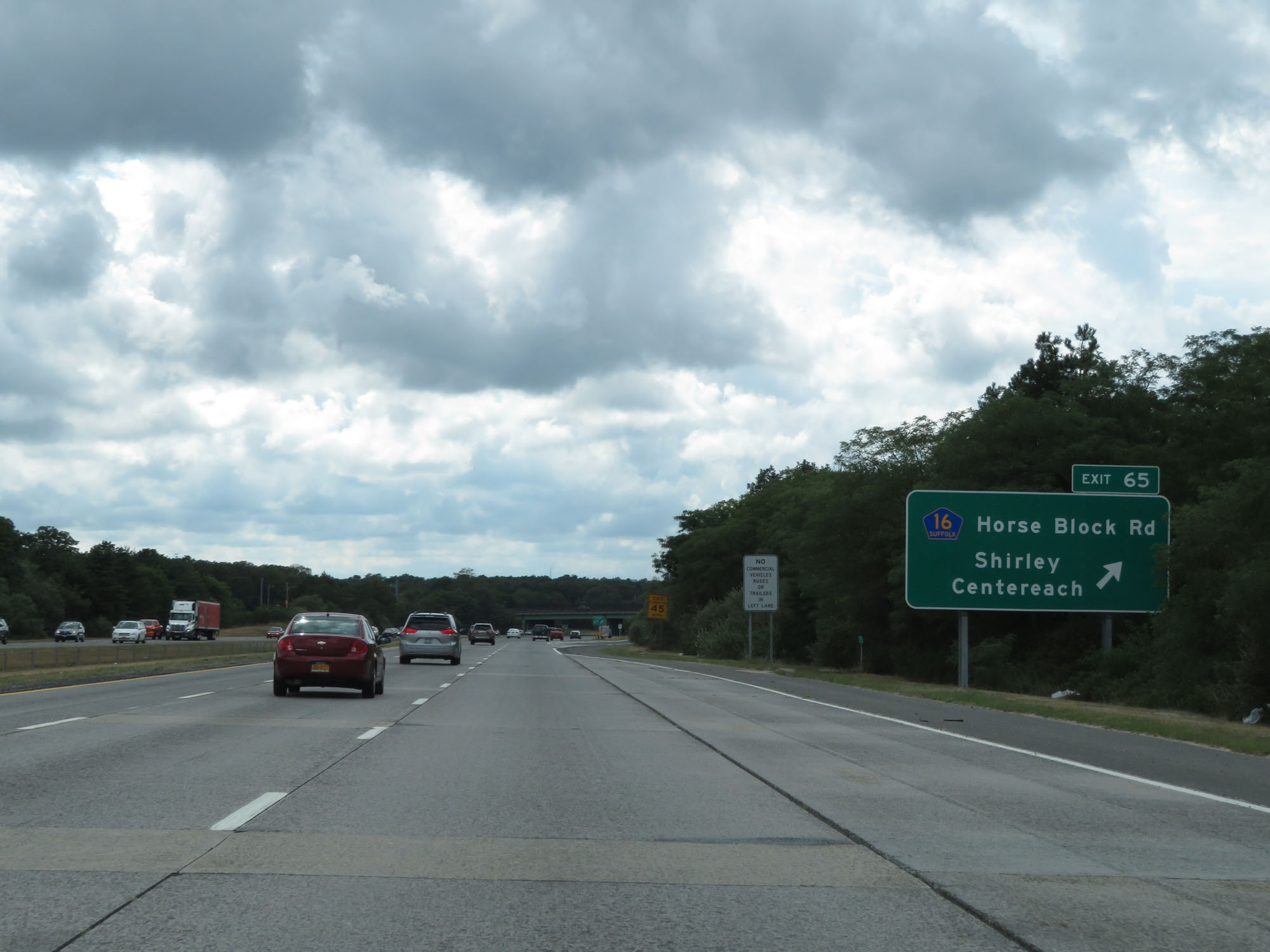 Interstate 495 West (Long Island Expressway) at Exit 65: CR 16 - Horse Block Rd / Shirley / Centereach (Photo taken 8/20/16). |