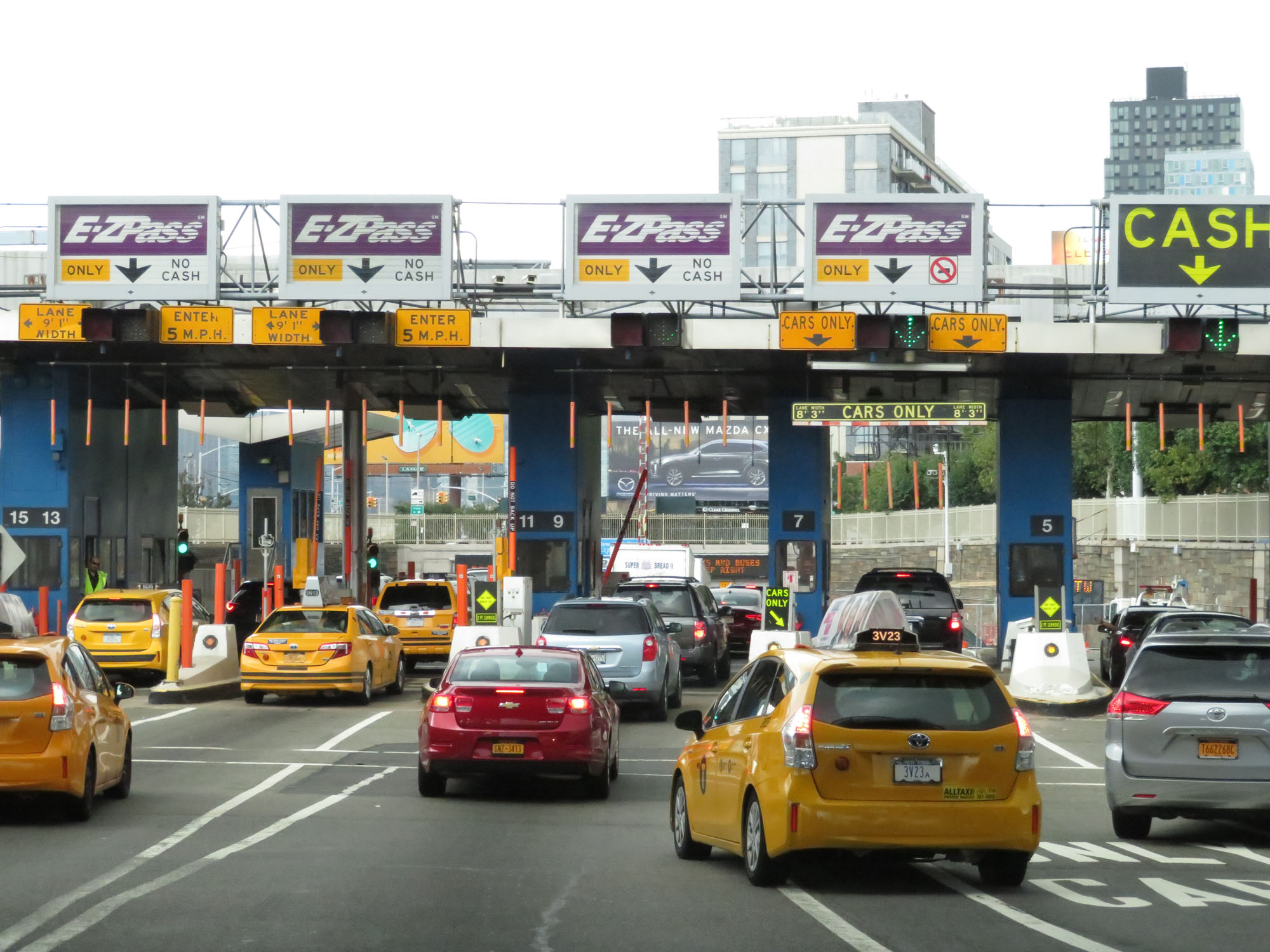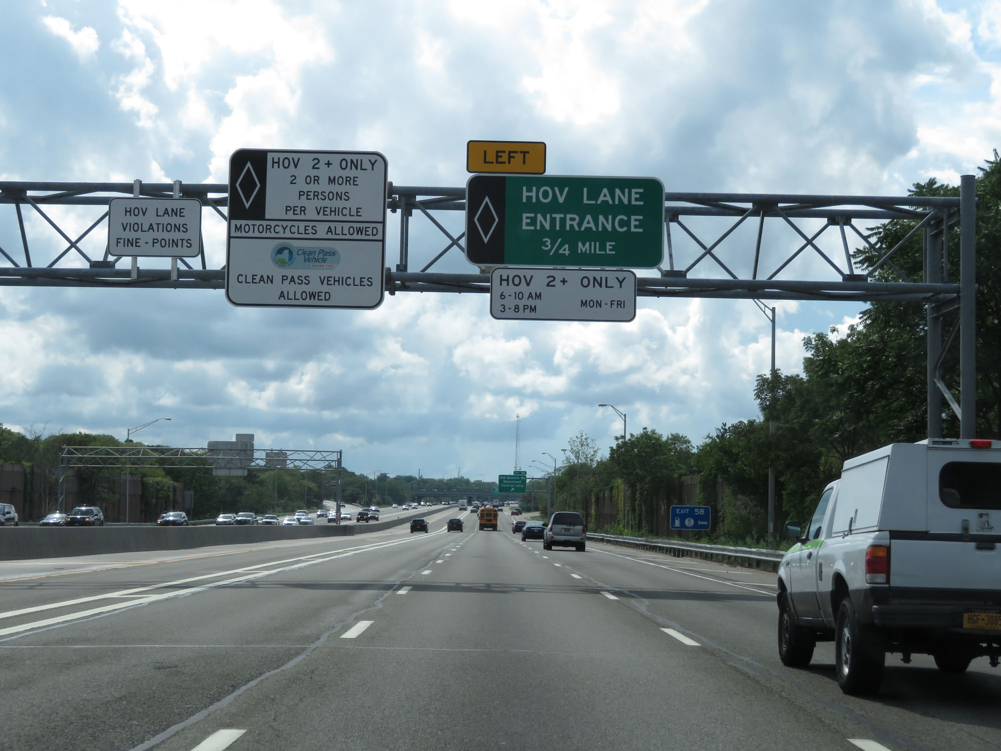 The leftmost of these overhead signs explain what vehicles are permitted in the HOV lanes on the Long Island Expressway. (Photo taken 8/20/16). |