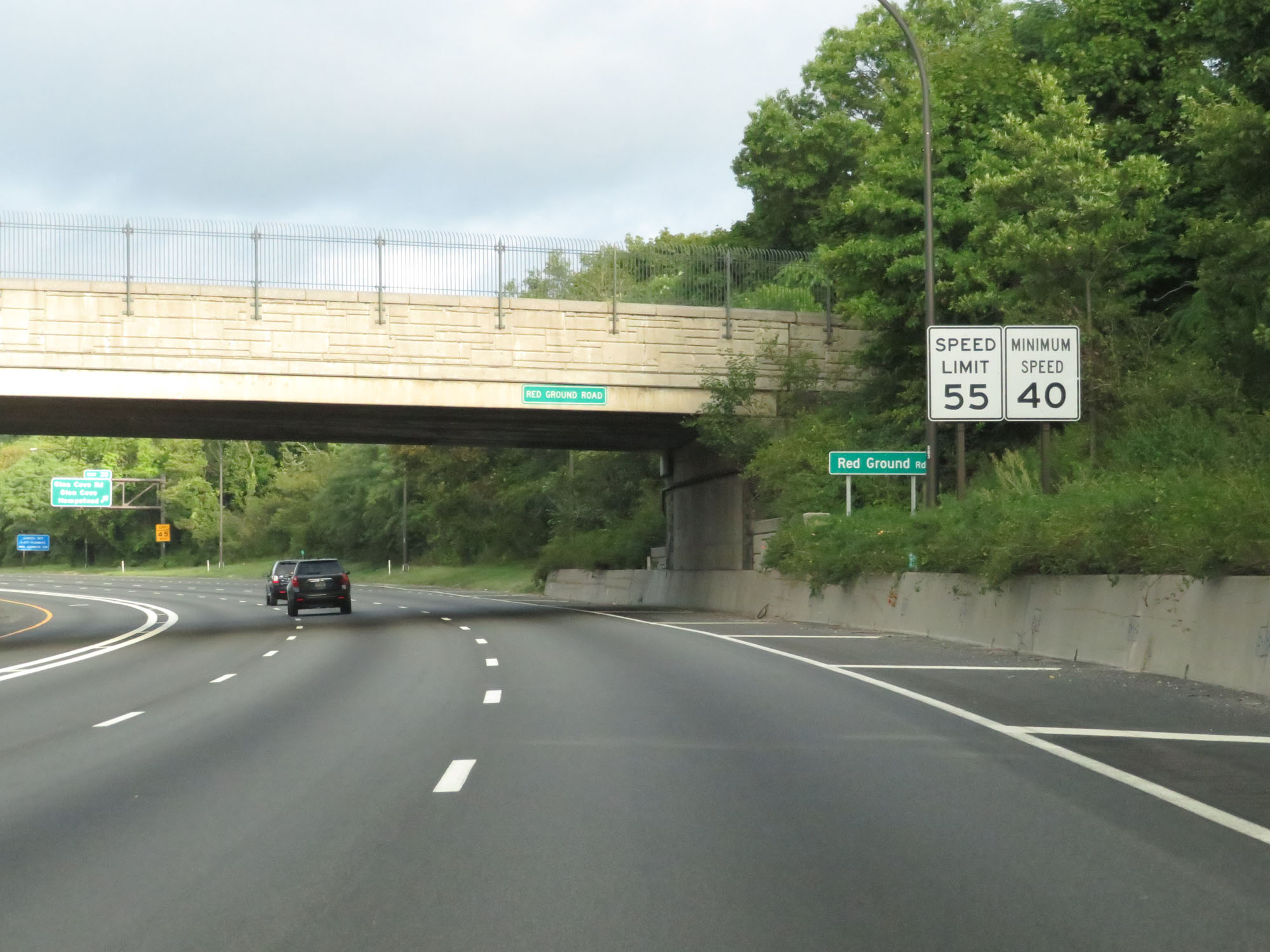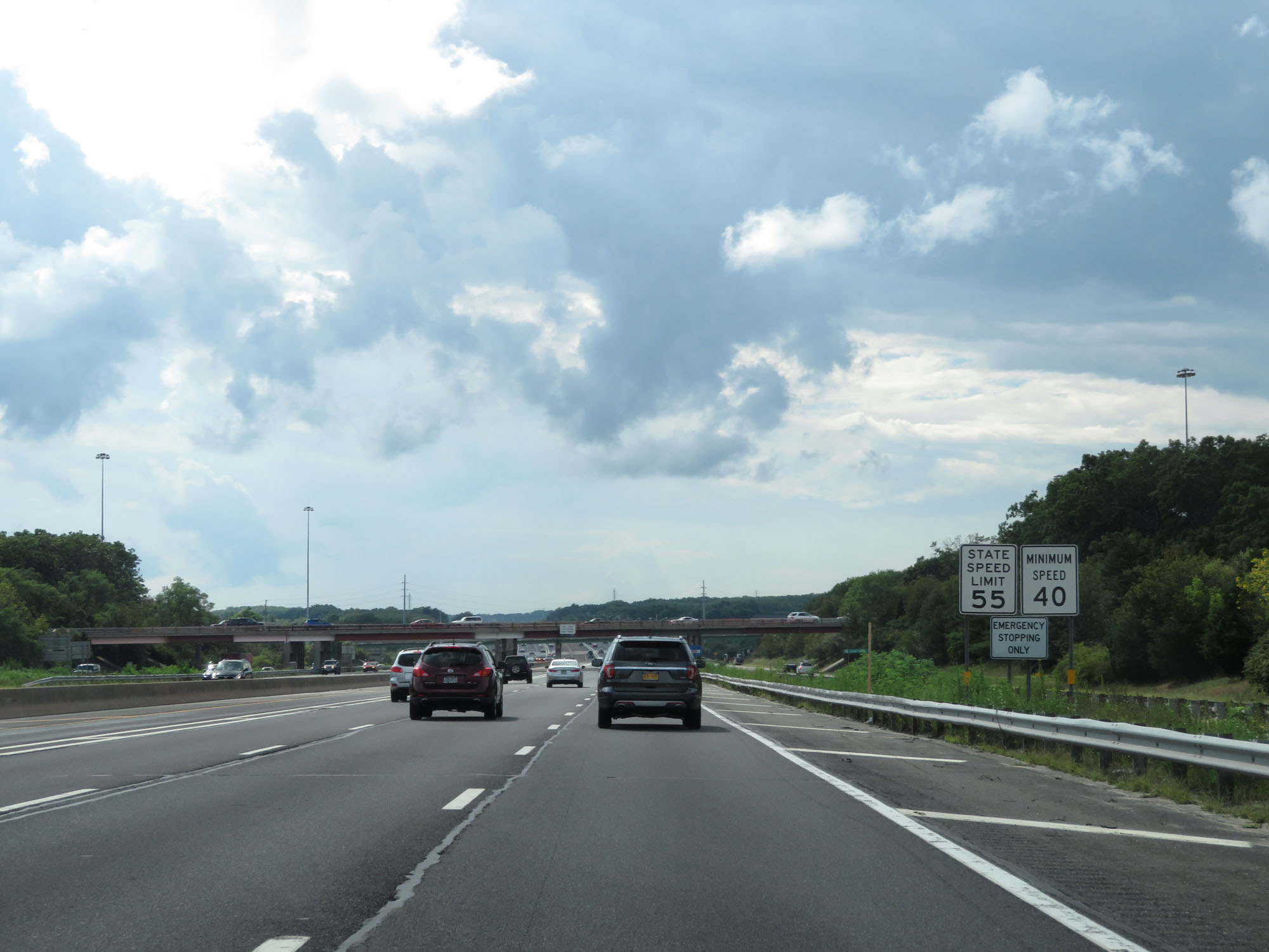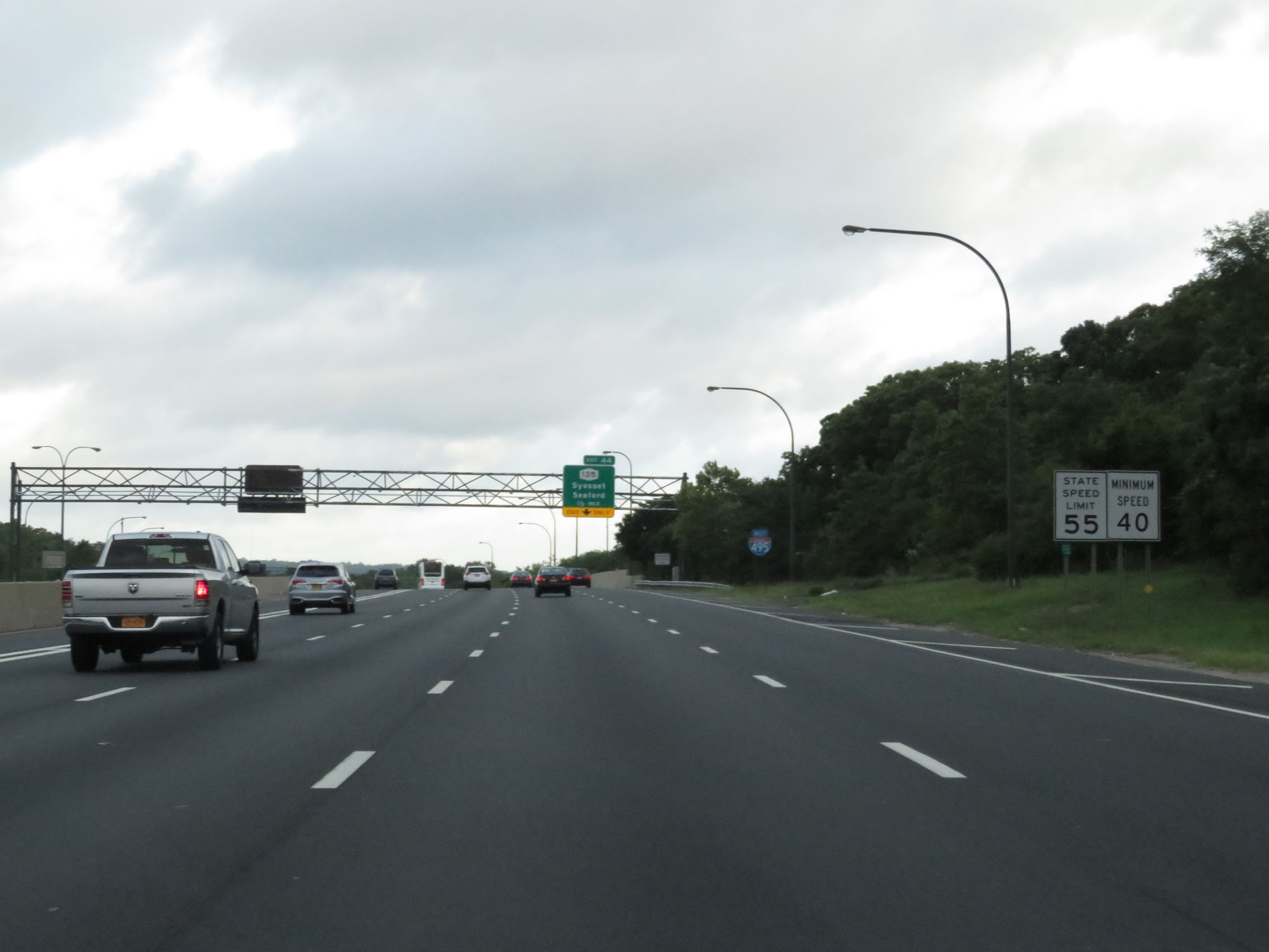 Speed limit signs on Interstate 495 West (Long Island Expressway). Despite starting out in a somewhat rural area, the speed limit is 55 mph with a minimum speed limit of 40 mph. 55 mph is the highest posted speed limit on the Long Island Expressway, if you can believe that. (Photo taken 8/20/16). |