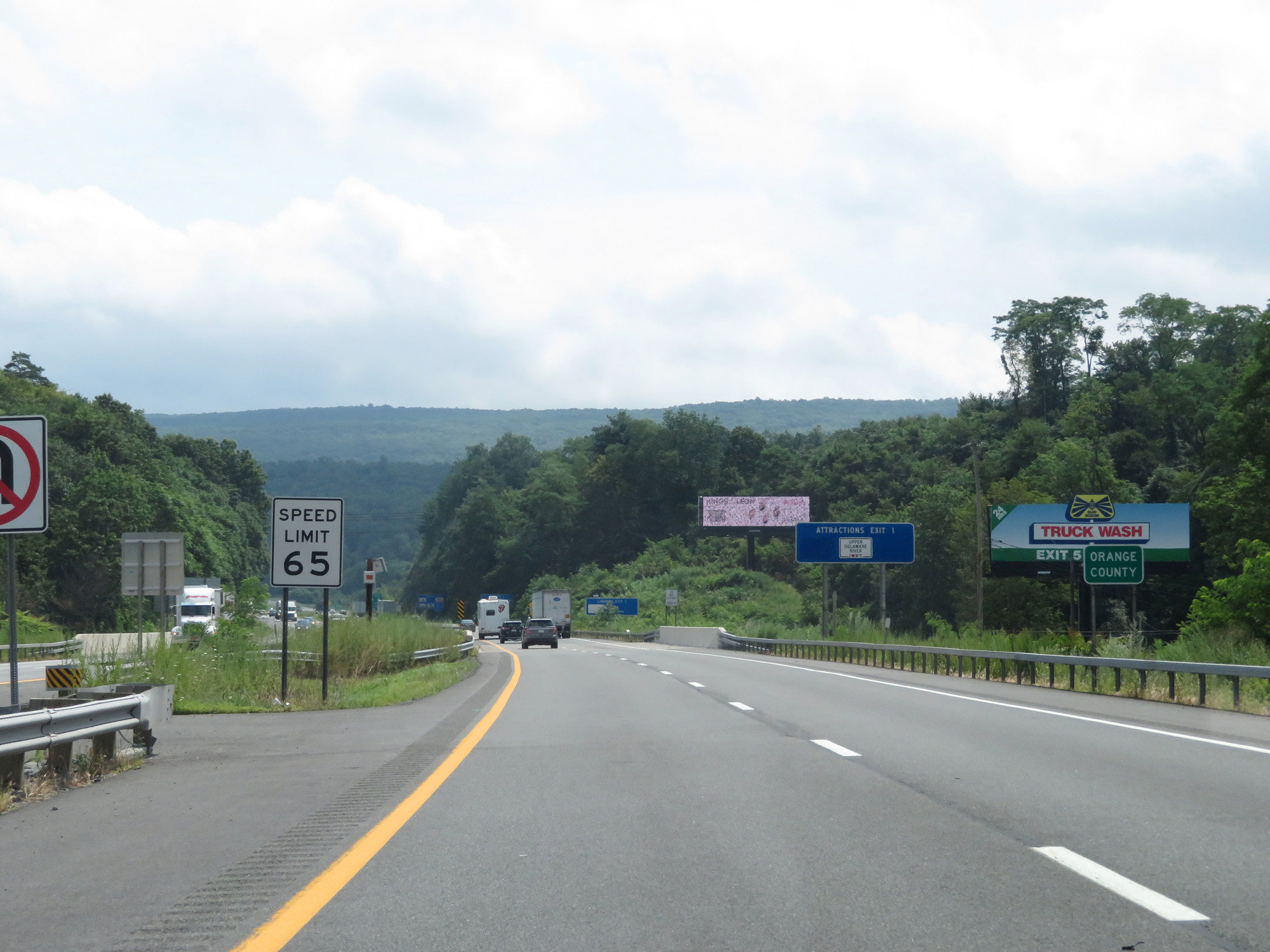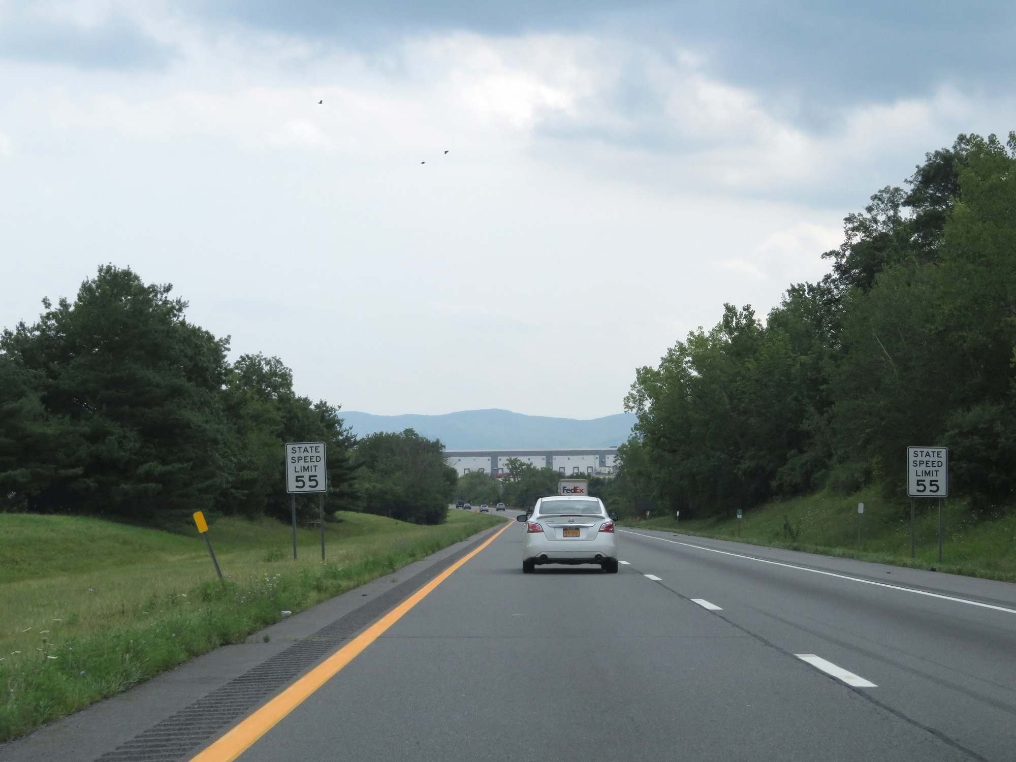 Entering New York from Pennsylvania on Interstate 84 East, the speed limit starts out at 65 mph. (Photo taken 8/4/17). |