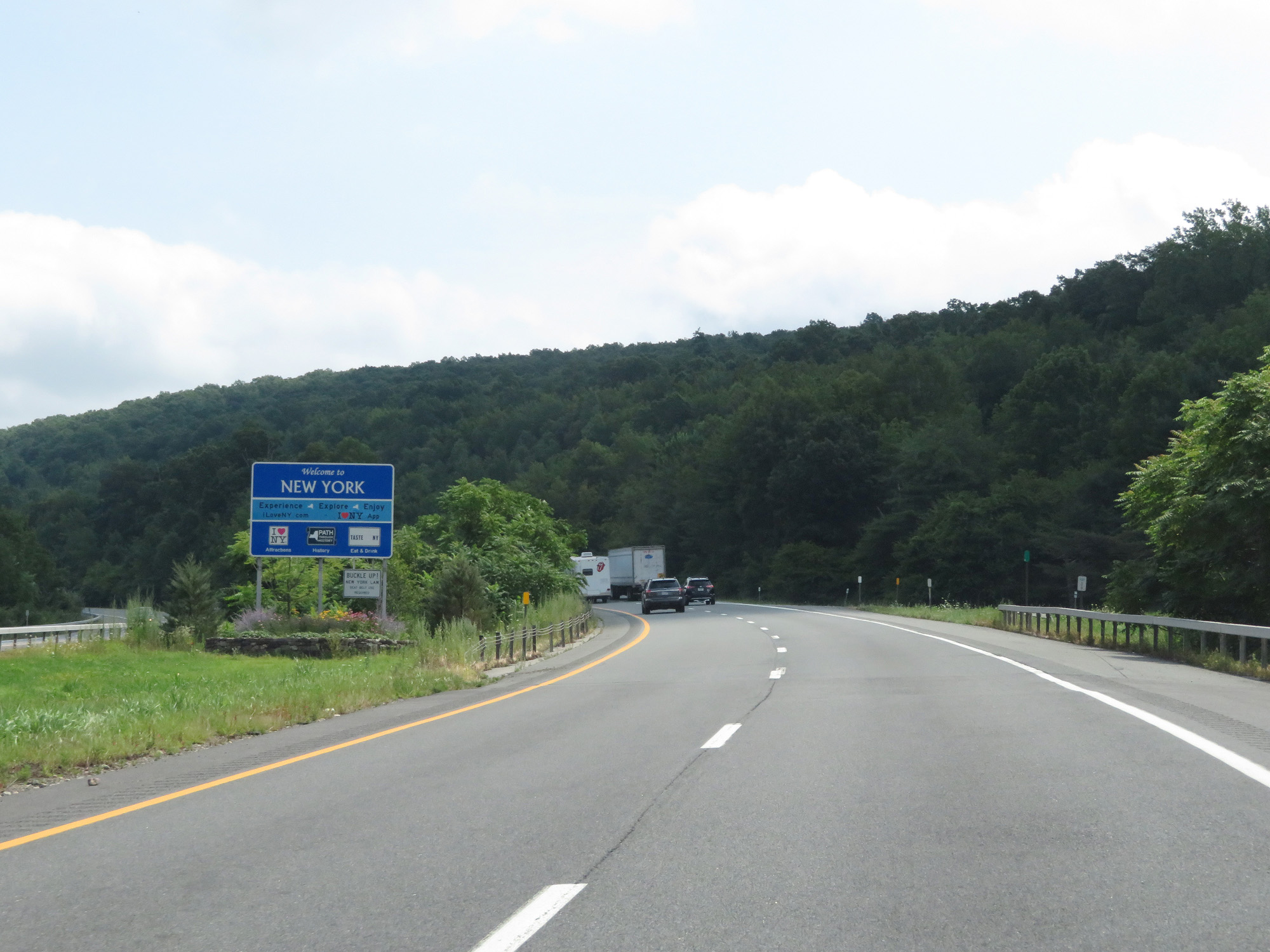 New York welcome sign on Interstate 84 East, just beyond Exit 1. (Photo taken 8/4/17). |