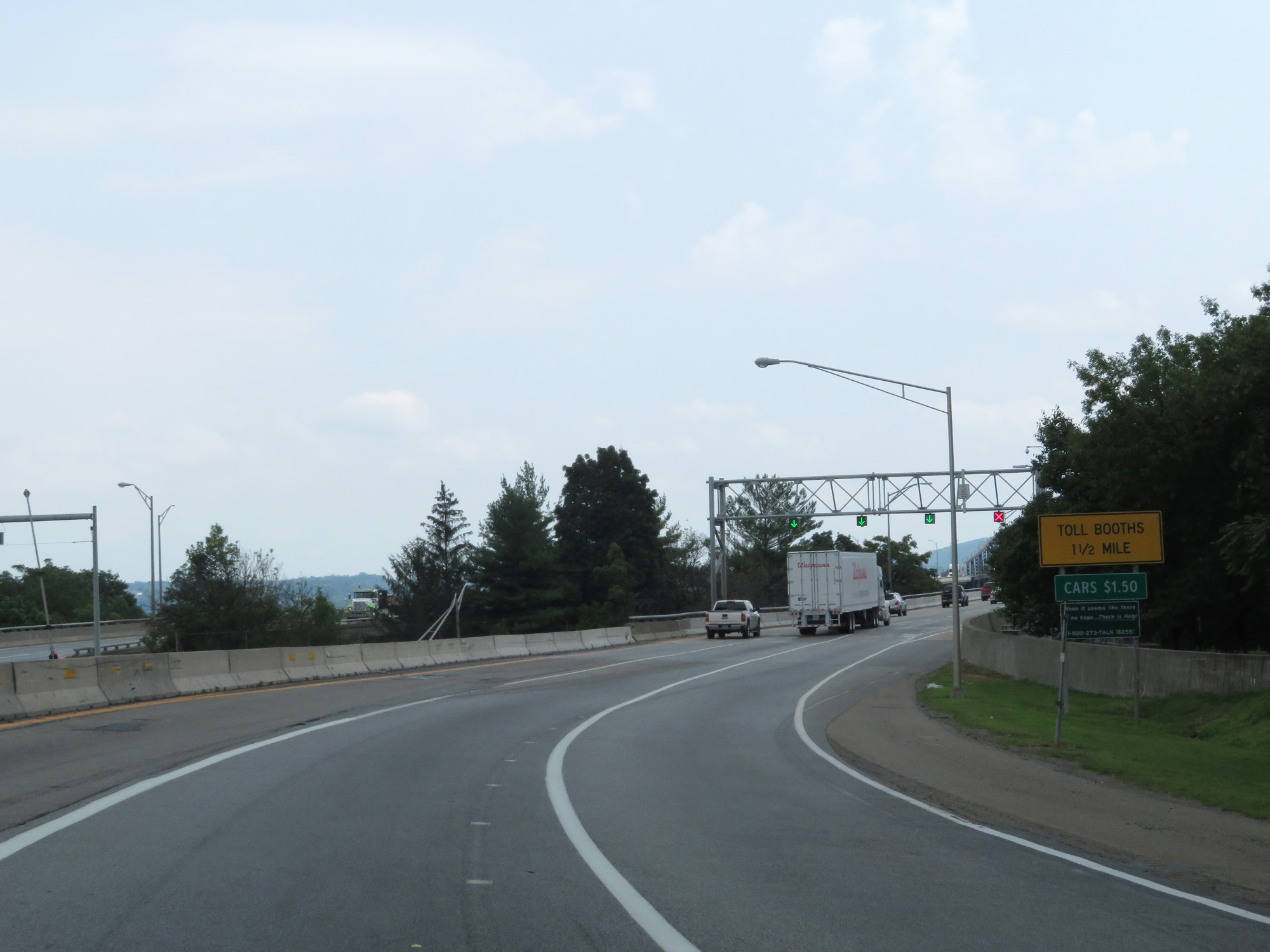 The toll booths for the Newburgh-Beacon bridge are on its eastern side, 1 1/2 miles ahead. The toll rate for passenger cars at the time was $1.50. (Photo taken 8/4/17). |