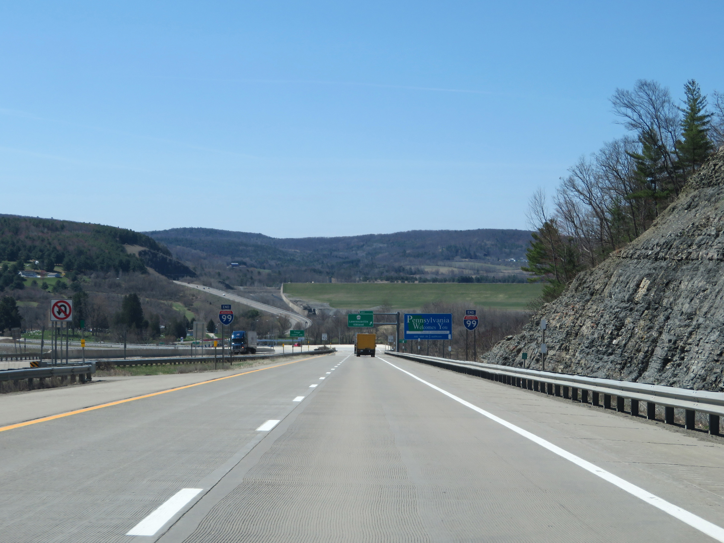 Interstate 99 END shields as the Pennsylvania state line and welcome sign come into view. US 15 will proceed south to Williamsport as the Future Interstate 99 corridor. (Photo taken 4/14/17). |