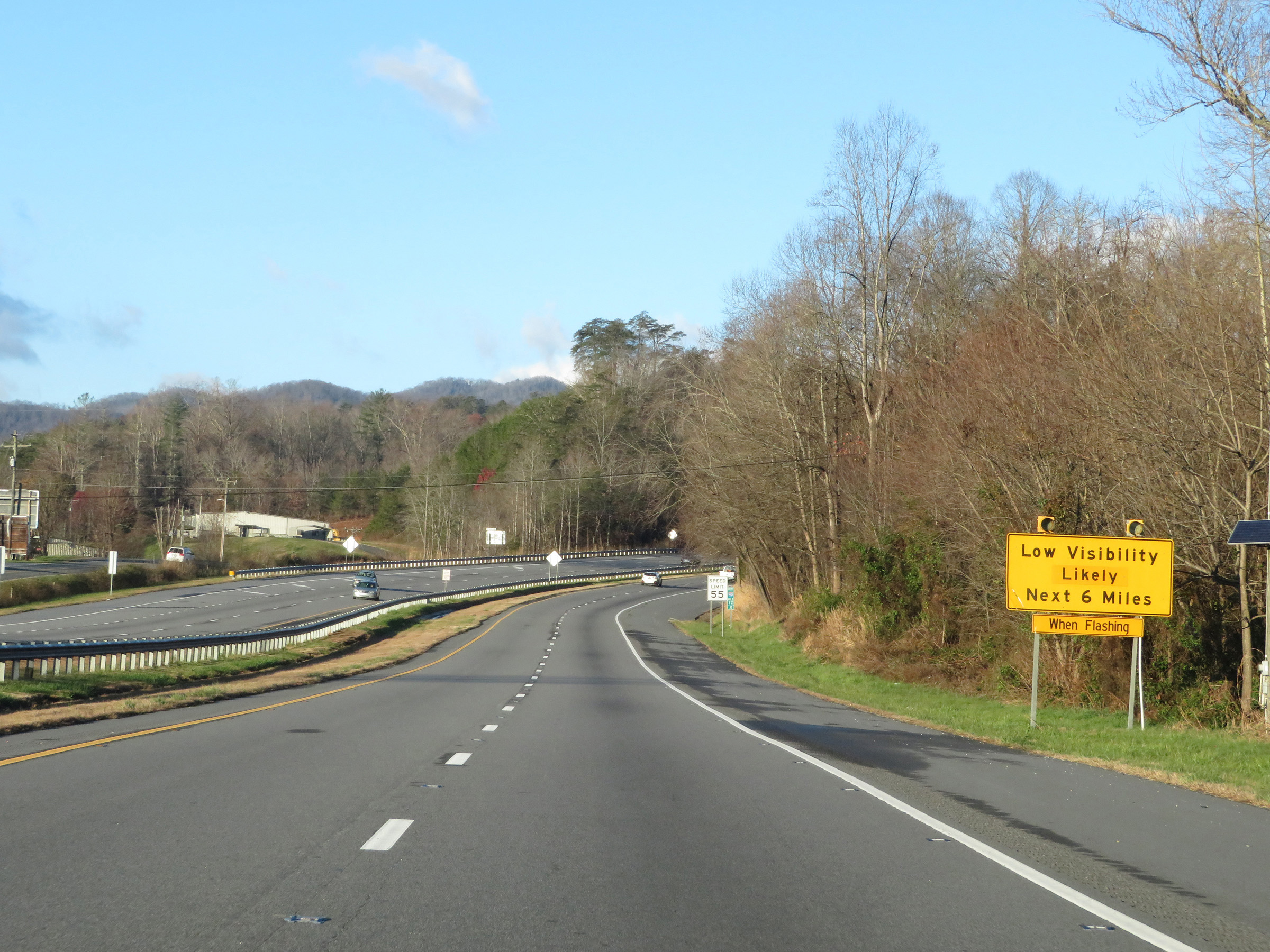 As Interstate 40 West approaches Old Fort Mountain, which it will climb for the next 6 miles, this sign warns that low visibility is likely when its lights are flashing. (Photo taken 12/5/20). |