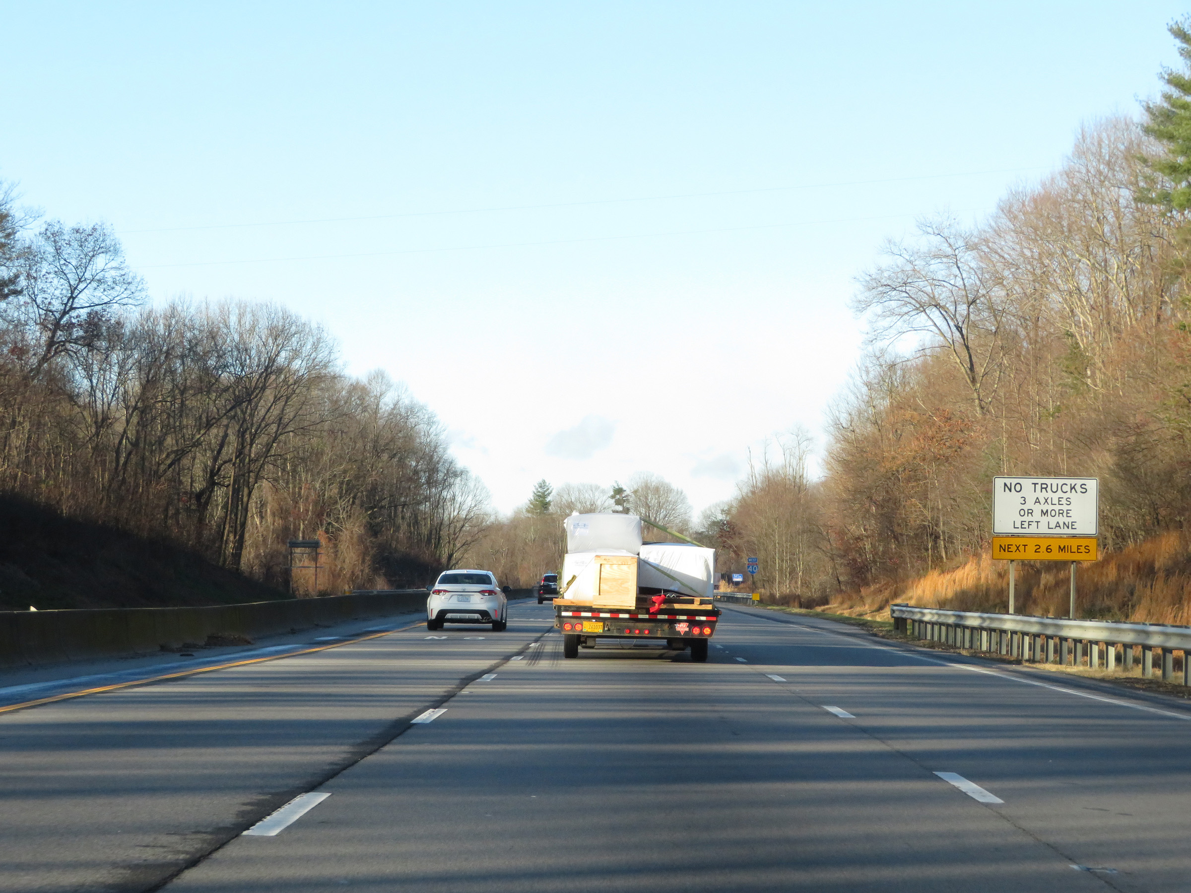 As the ascent up Old Fort Mountain begins, this sign warns that trucks of 3 axles or more are prohibited in the left lane for the next 6 miles to the summit of Old Fort Mountain. (Photo taken 12/5/20). |