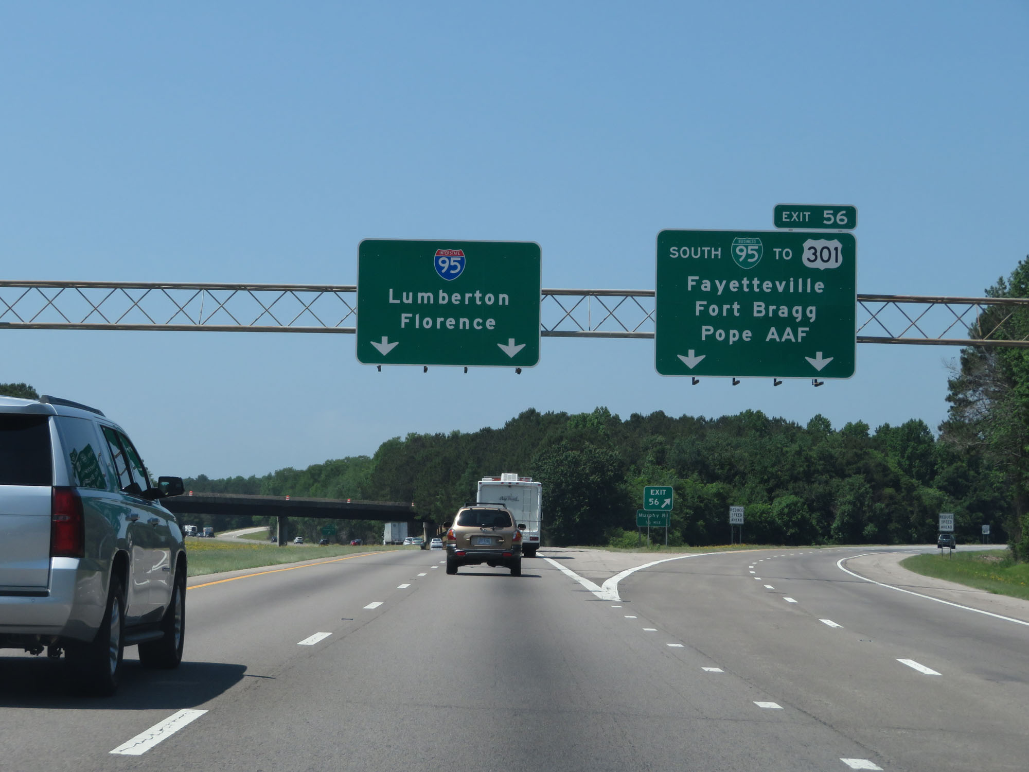 Interstate 95 South at Exit 56: Interstate 95 BR South / To US 301 - Fayetteville / Fort Bragg / Pope AAF (Photo taken 5/20/17). |