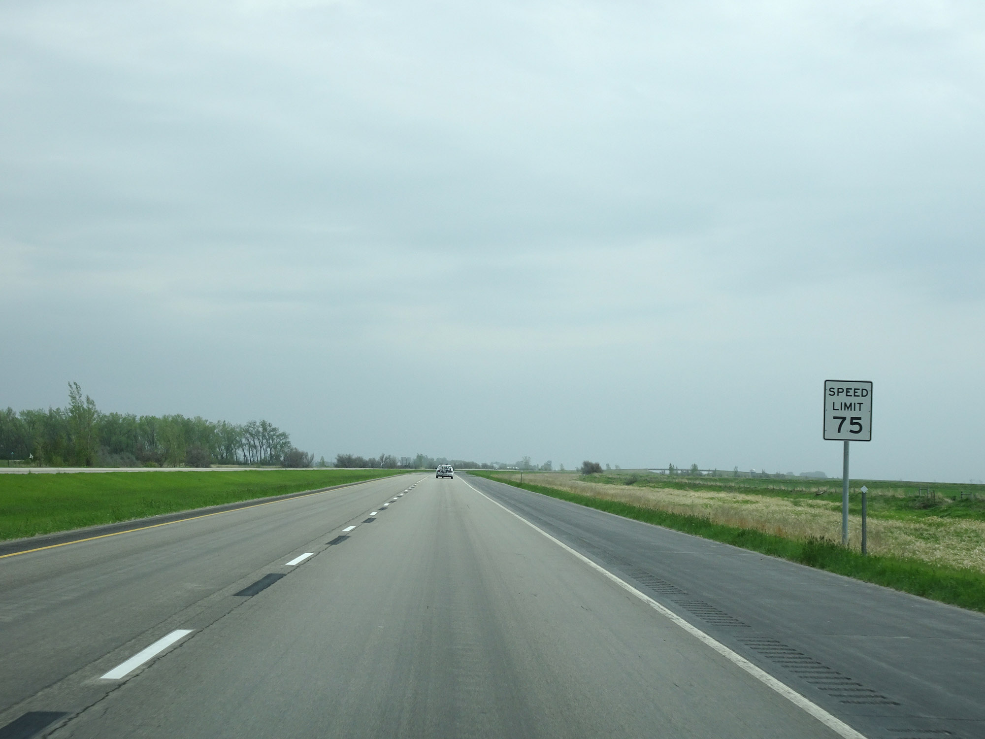 Shortly afterwards, the speed limit on Interstate 29 South increases to 75 mph. This is the standard speed limit on most rural Interstate highways in North Dakota. (Photo taken 5/22/16). |