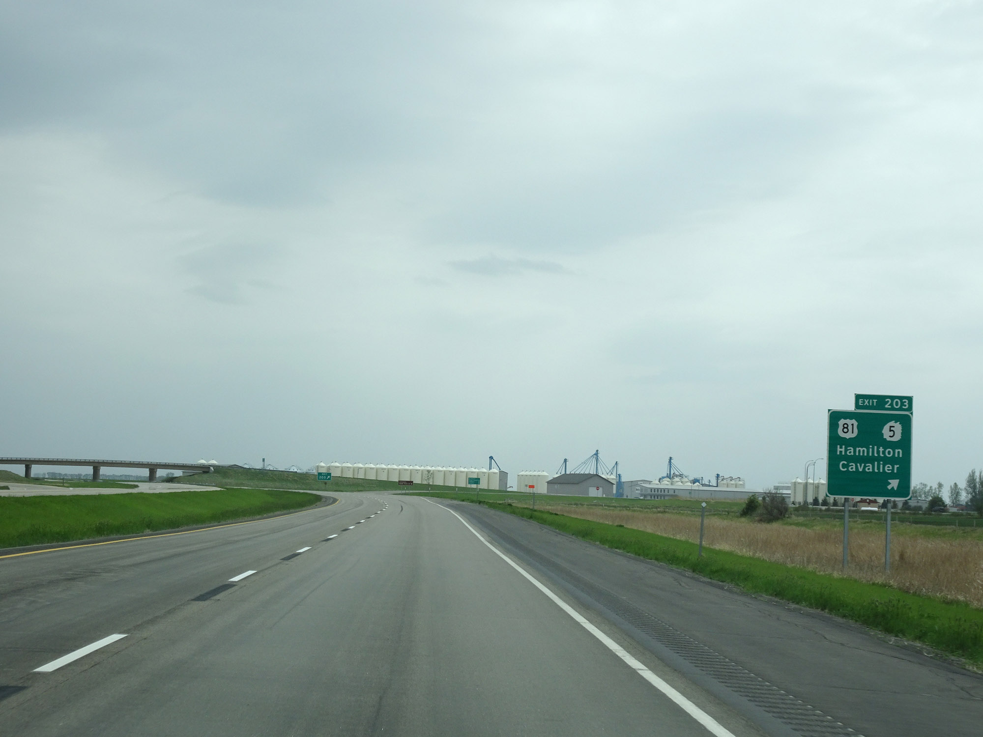 Interstate 29 South at Exit 203: US 81 / ND 5 - Hamilton / Cavalier (Photo taken 5/22/16). |