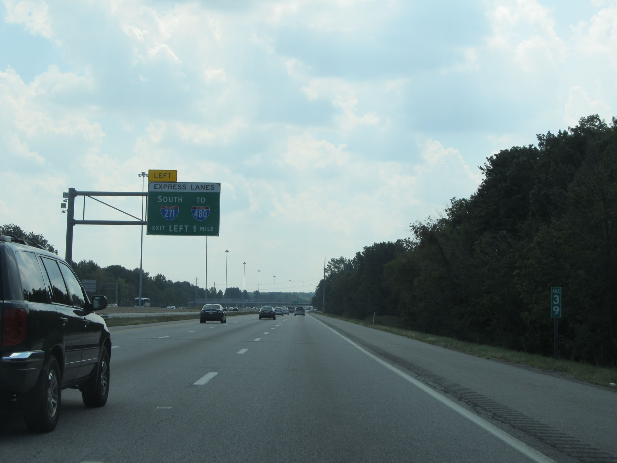 Interstate 271 South at mile marker 39. The express lanes of I-271 will begin 1 mile ahead, and the entrance to them will be on the left. (Photo taken 9/7/15). |