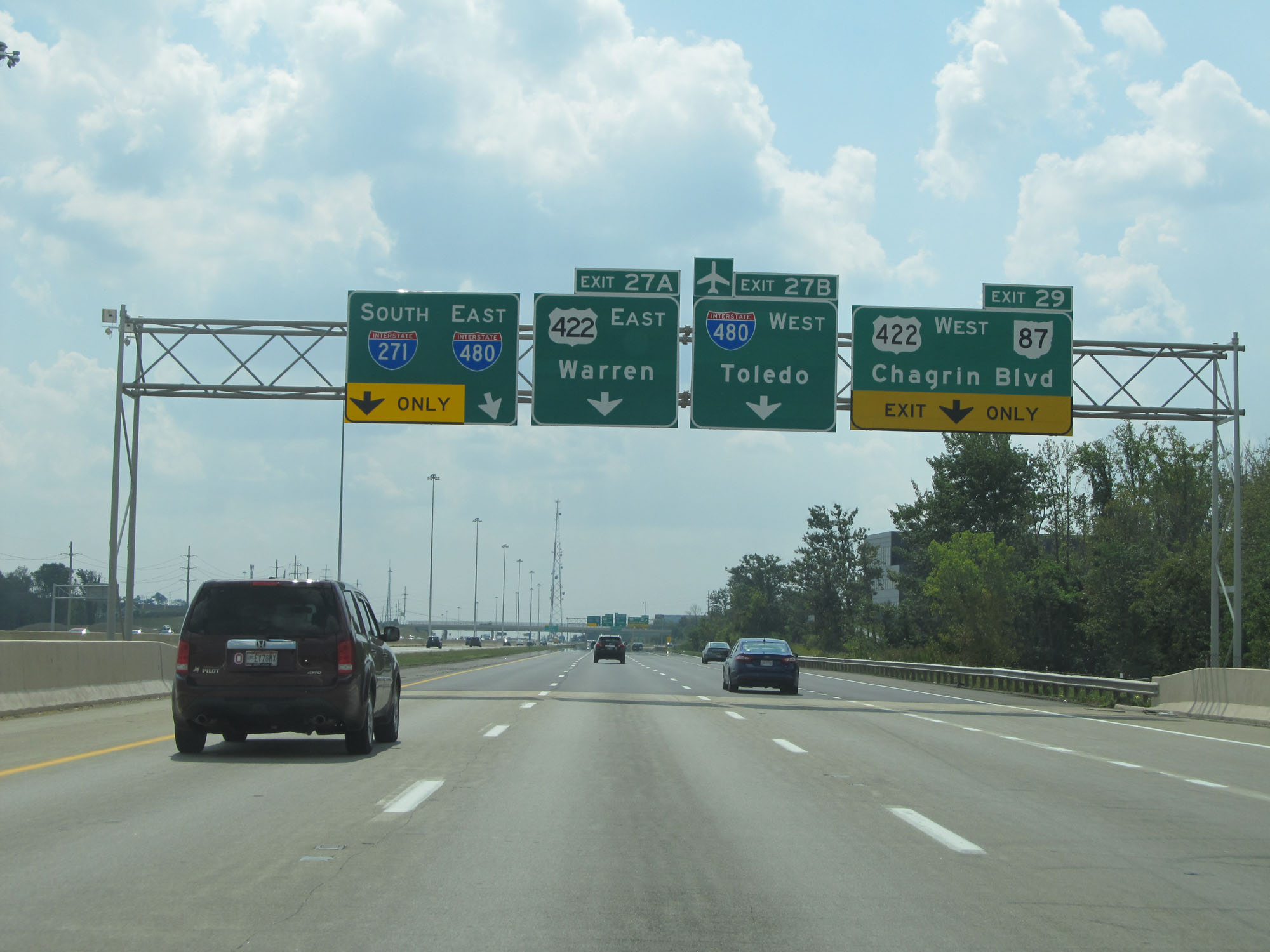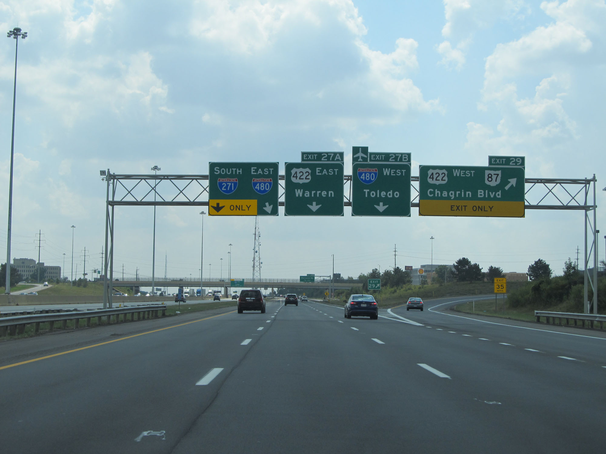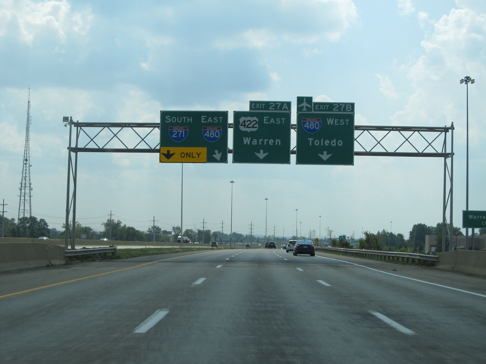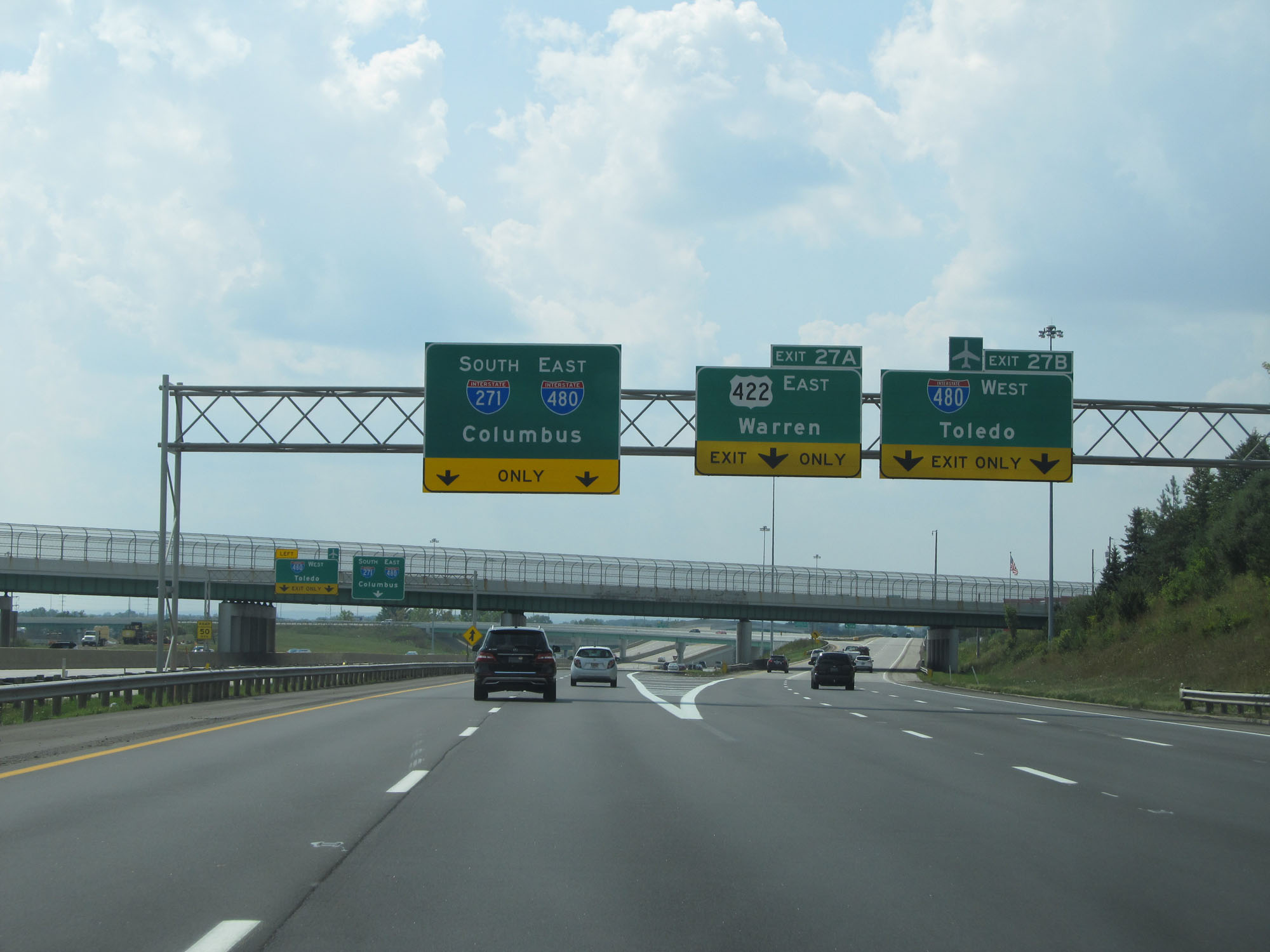 Interstate 271 South at Exit 27B: Interstate 480 West - Toledo; Exit 27A: US 422 East - Warren (Photo taken 9/7/15). |