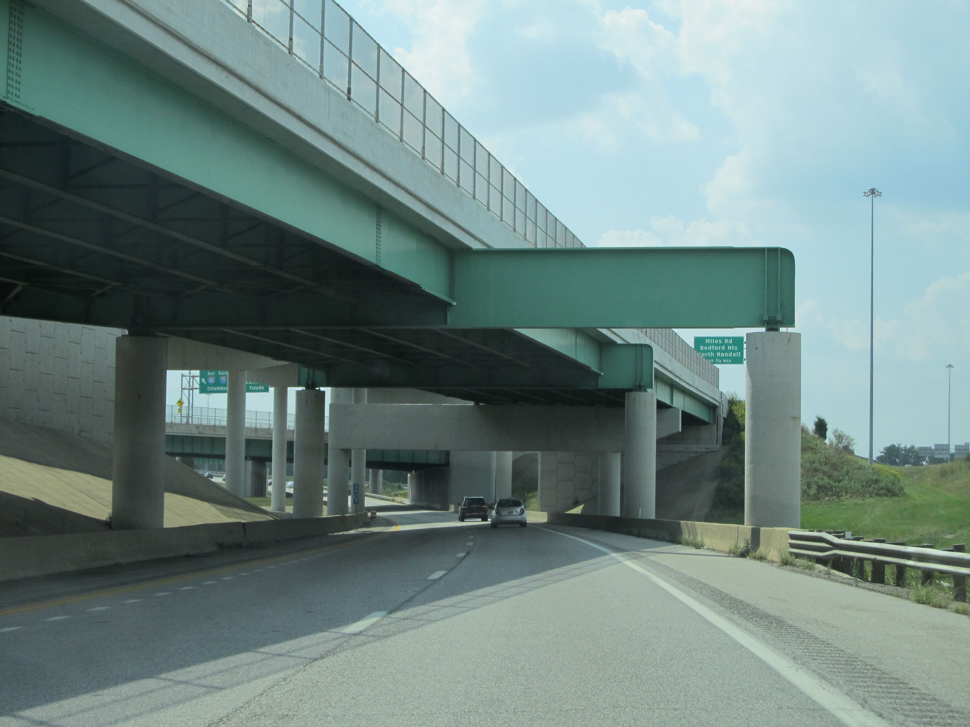 View on Interstate 271 South as it passes under the ramps from Interstate 480 East to Interstate 271 North's express and local lanes. I-271 South and I-480 East will run concurrently ahead, beyond Exit 26. (Photo taken 9/7/15). |