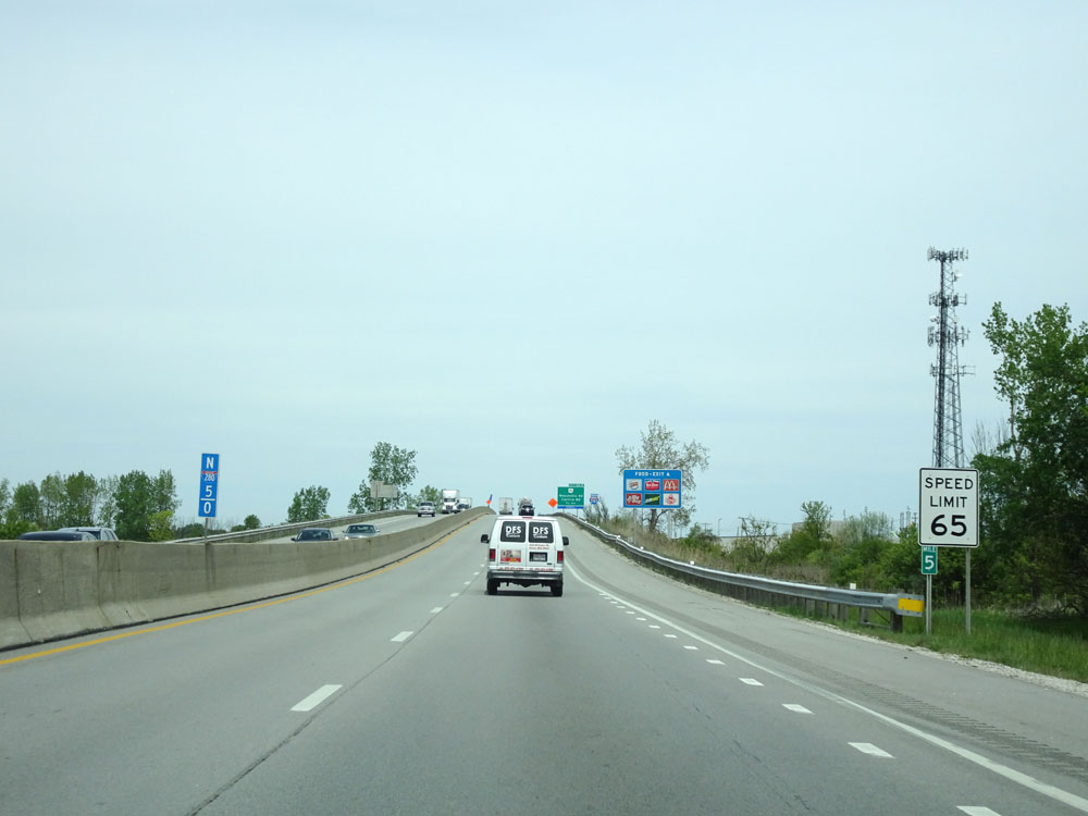 Interstate 280 North at the junction of Interstate 75, which marks its northern terminus. Stay in the two rightmost lanes to go onto Interstate 75 North toward Detroit. Be in the leftmost lane to access Interstate 75 South toward downtown Toledo. (Photo taken 5/20/16). |