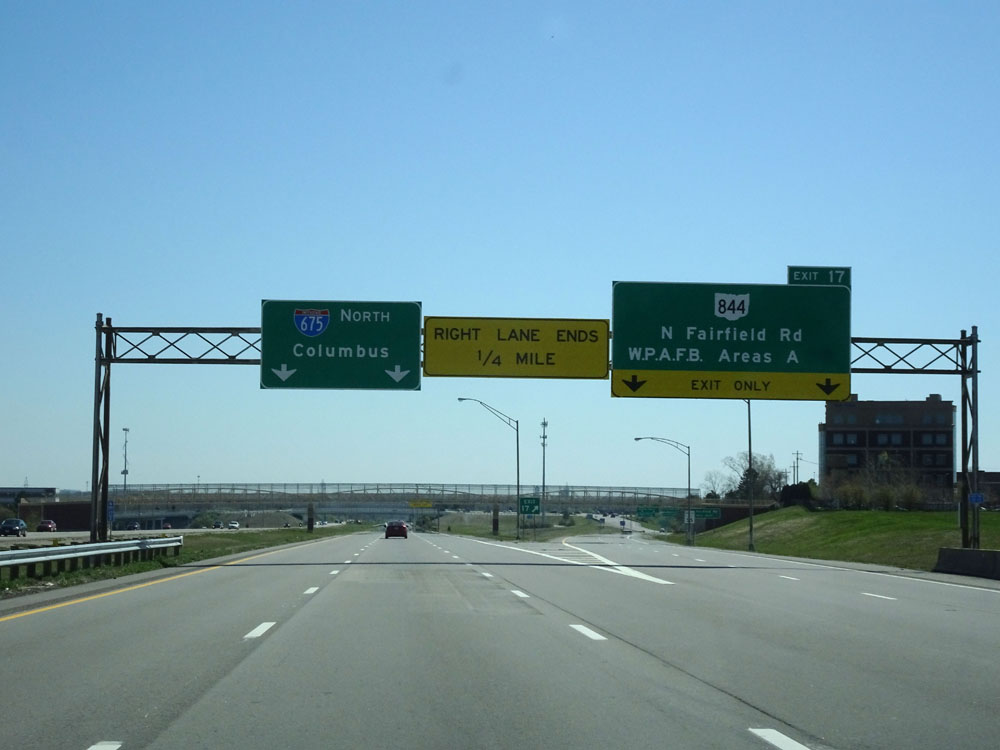 Interstate 675 North at Exit 17: OH 844 - N Fairfield Rd / W.P.A.F.B. Area A (Photo taken 4/17/16). |