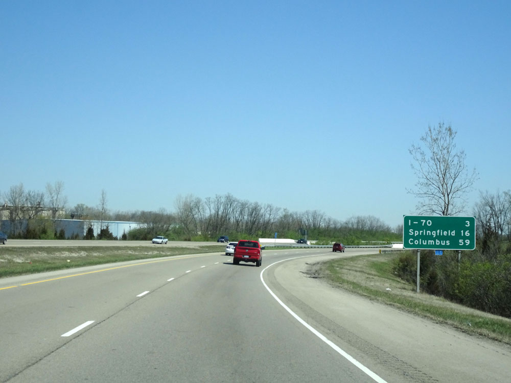 Mileage sign north of Exit 22. It's 3 miles to the junction of Interstate 70, 16 miles to Springfield and 59 miles to Columbus. (Photo taken 4/17/16). |