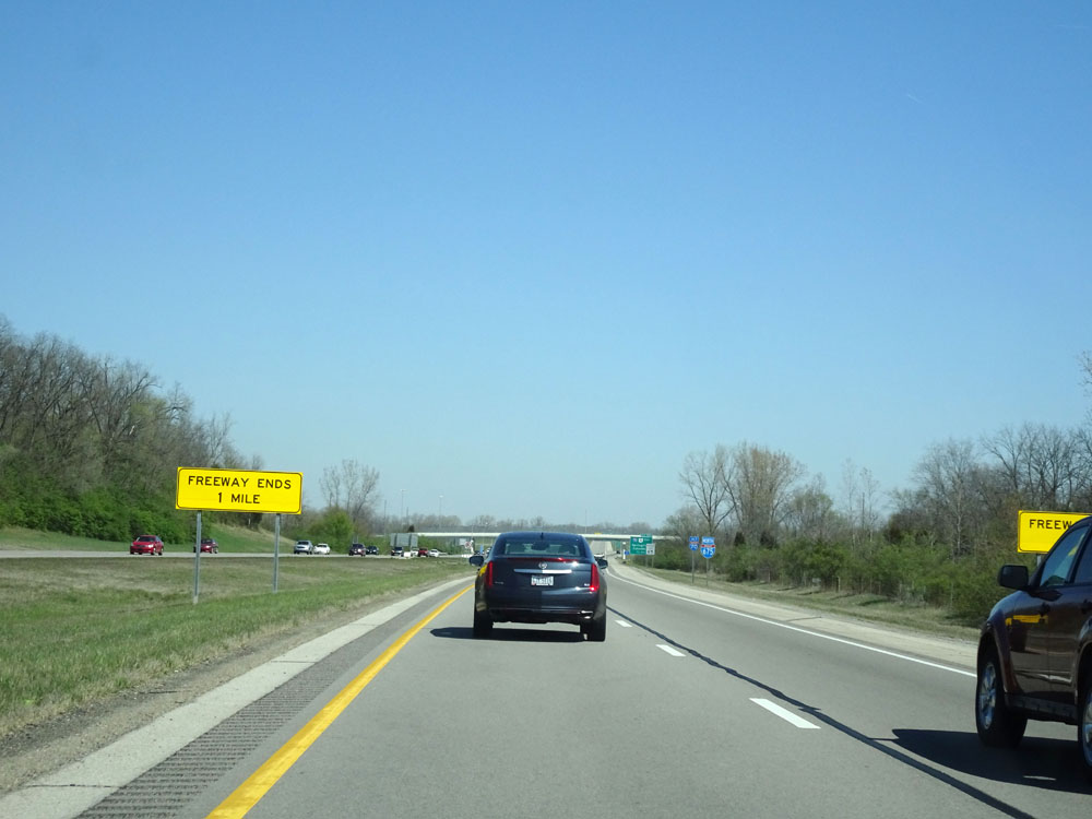 One mile from the northern terminus of Interstate 675, these signs warn that the freeway ends. As you will see at the northern terminus, the road is reduced to two lanes total and it continues north as Spangler Road. (Photo taken 4/17/16). |
