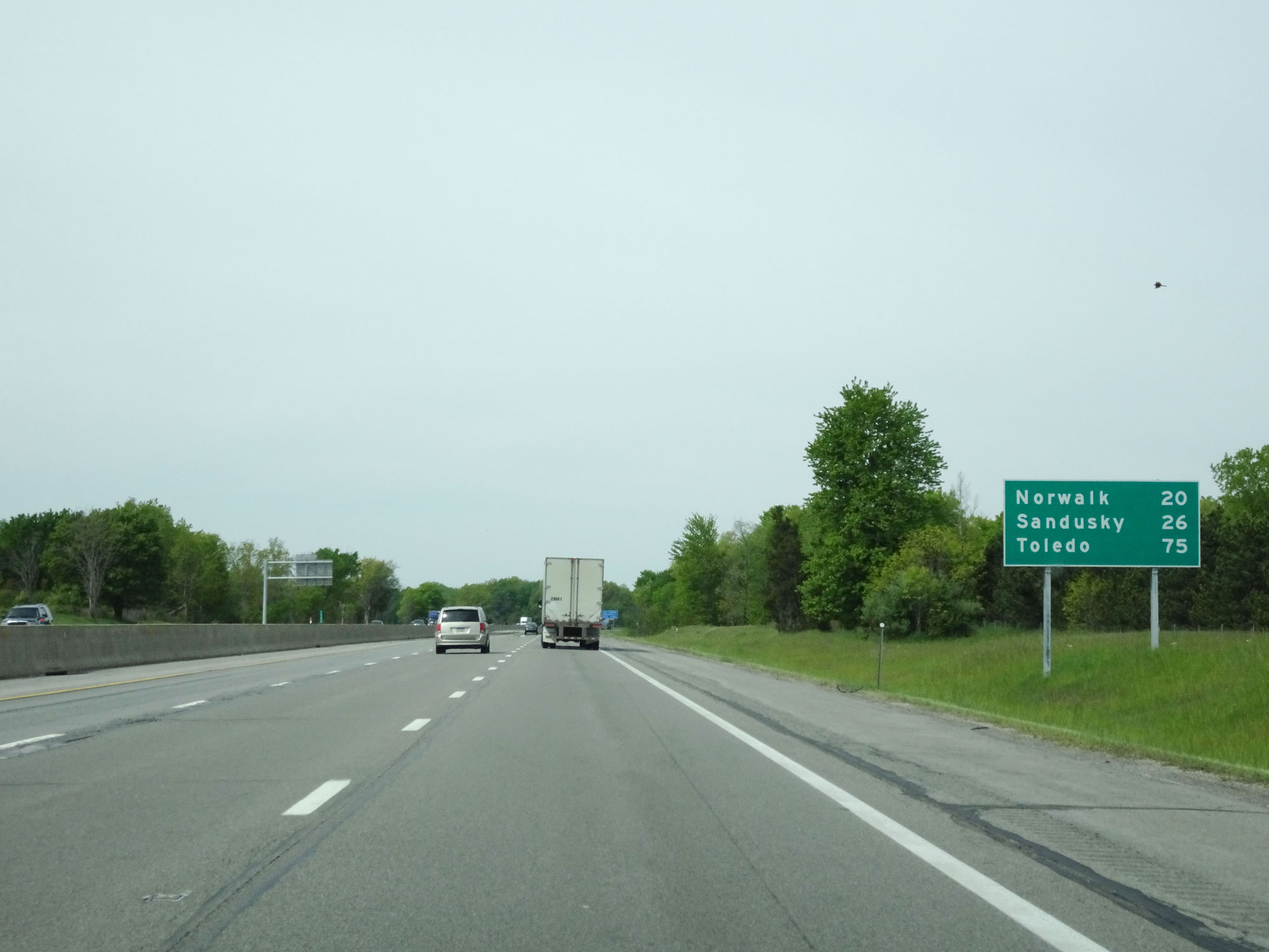Mileage sign west of Exit 135. It's 20 miles to Norwalk, 26 miles to Sandusky, and 75 miles to Toledo.  (Photo taken 5/20/16).