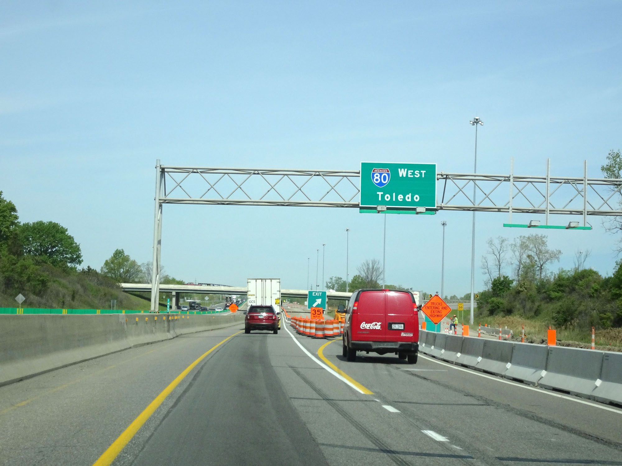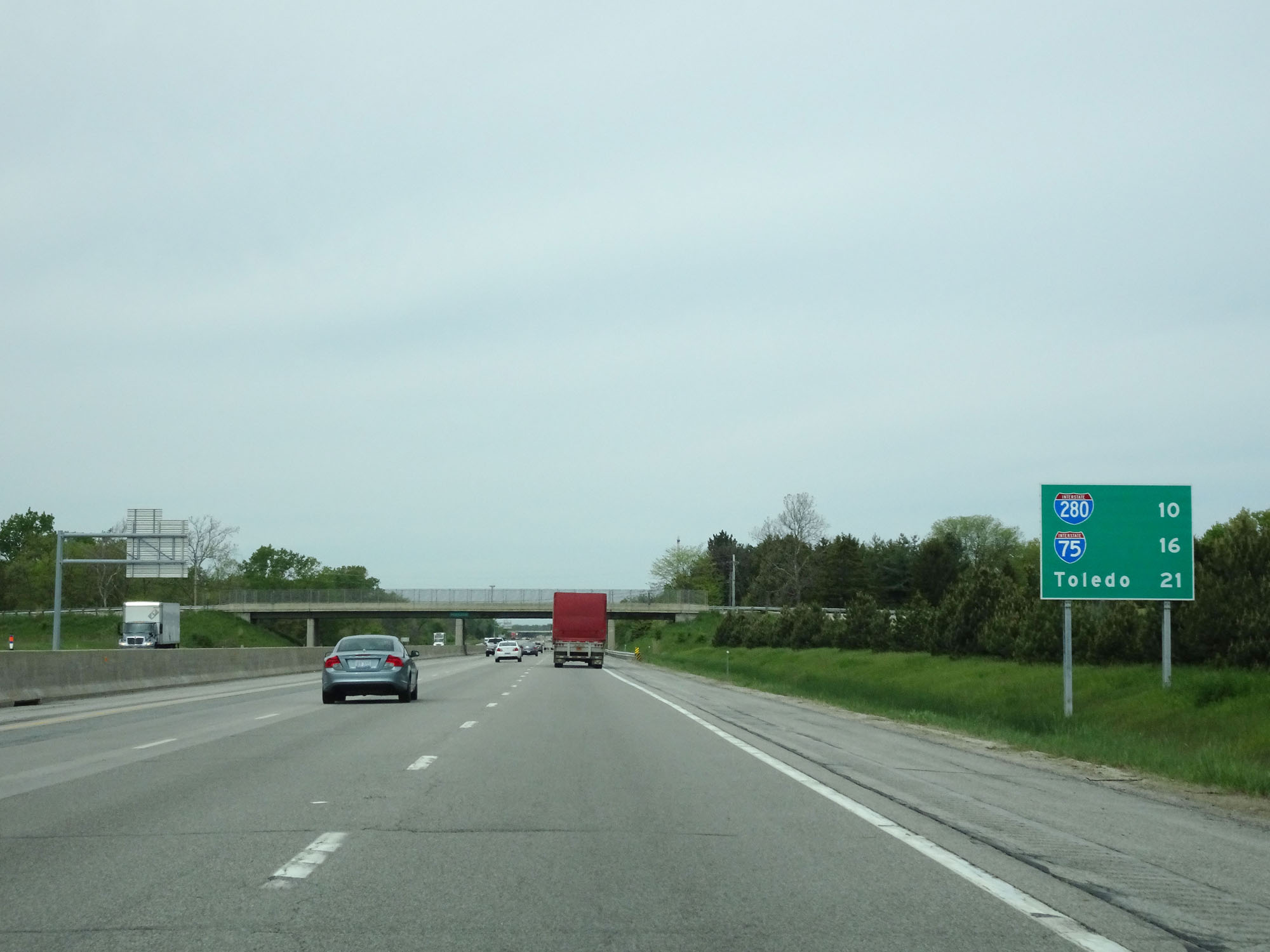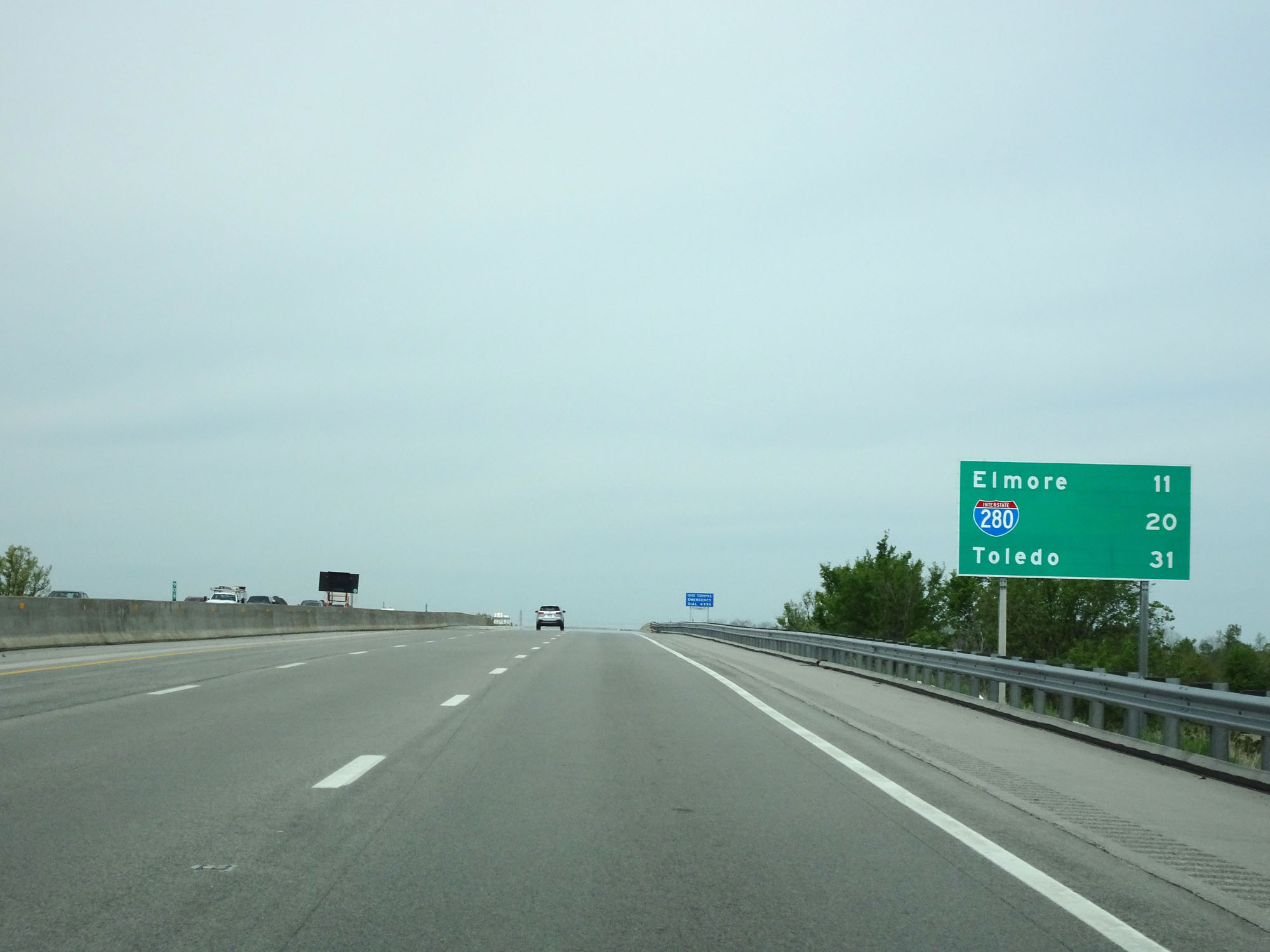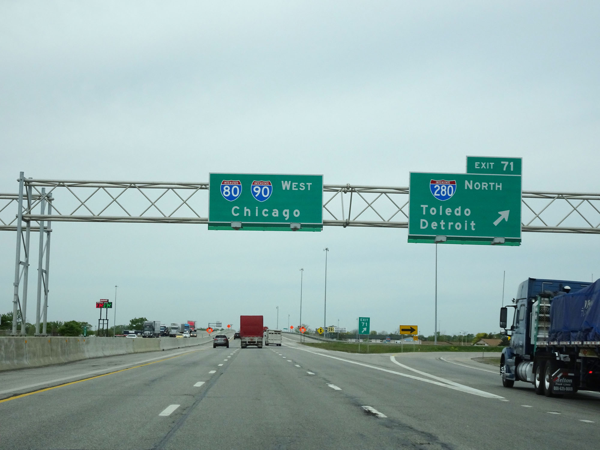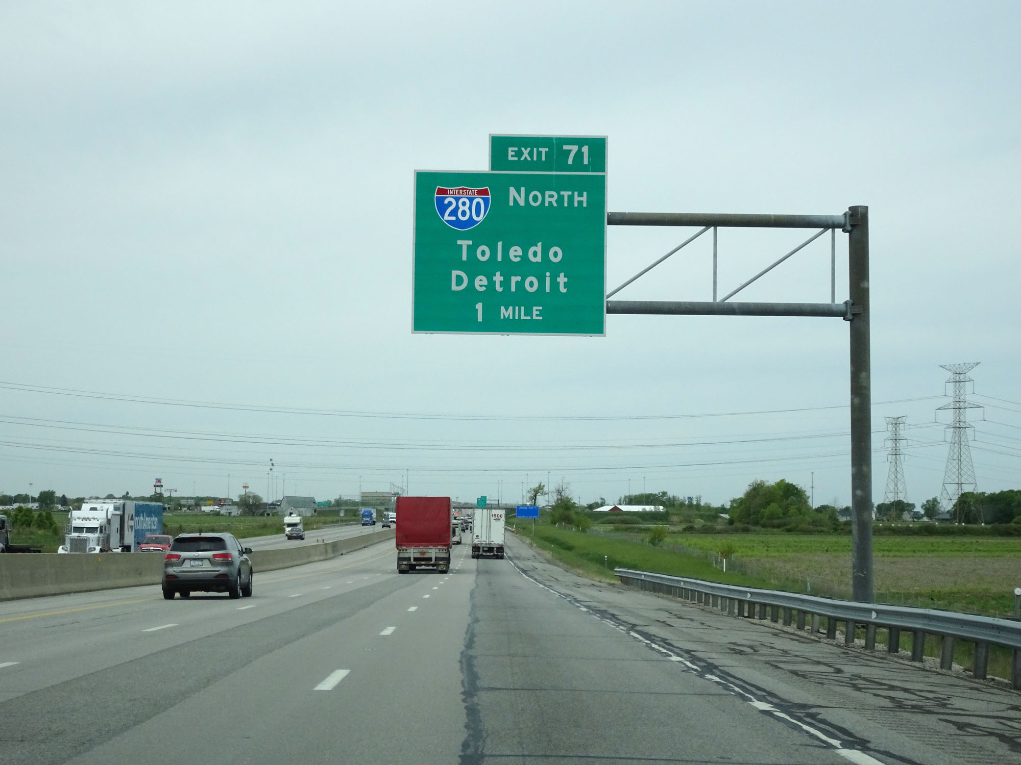 Interstate 80 / Interstate 90 West (Ohio Turnpike) at Exit 71: Interstate 280 North - Toledo / Detroit  (Photo taken 5/20/16).
