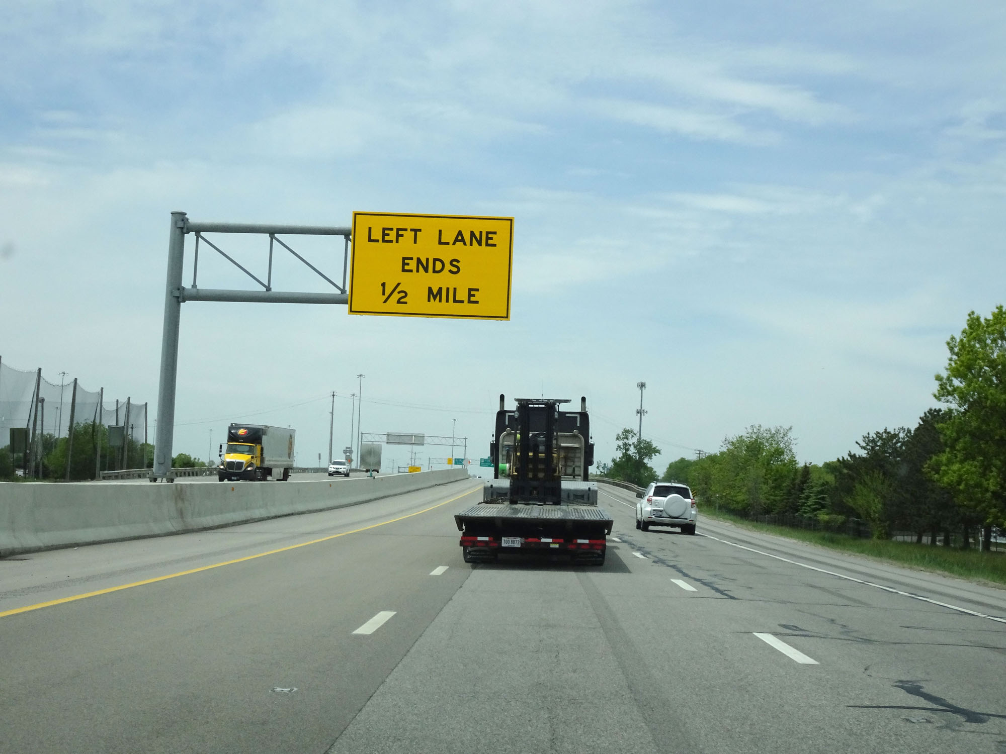 1/2 mile ahead, just beyond Exit 59, the left lane comes to an end and Interstate 80 / Interstate 90 West (Ohio Turnpike) is reduced to two lanes in each direction the rest of the way through Ohio.  (Photo taken 5/20/16).