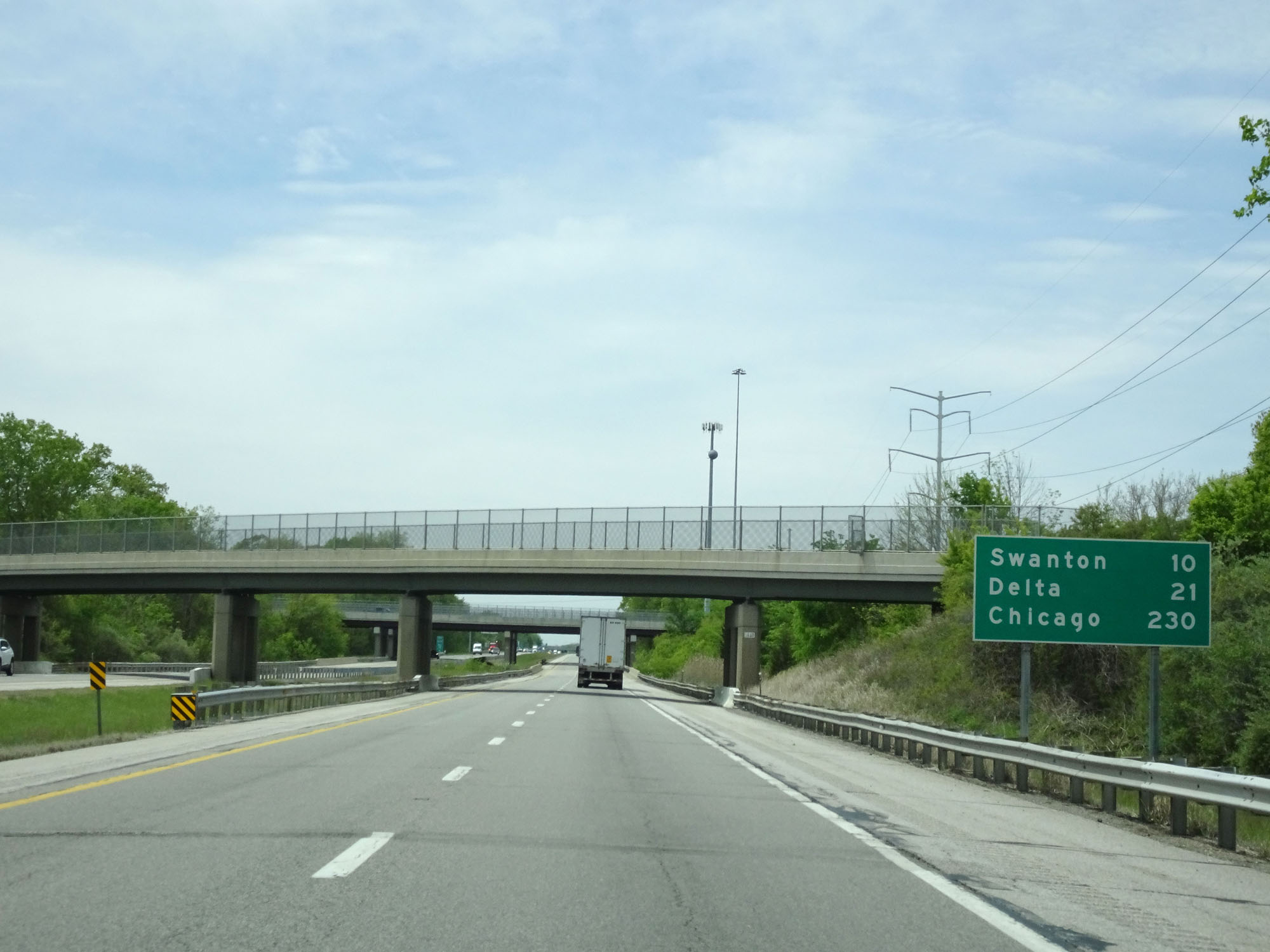 Mileage sign west of Exit 59. It's 10 miles to Swanton, 21 miles to Delta, and 230 miles to Chicago.  (Photo taken 5/20/16).