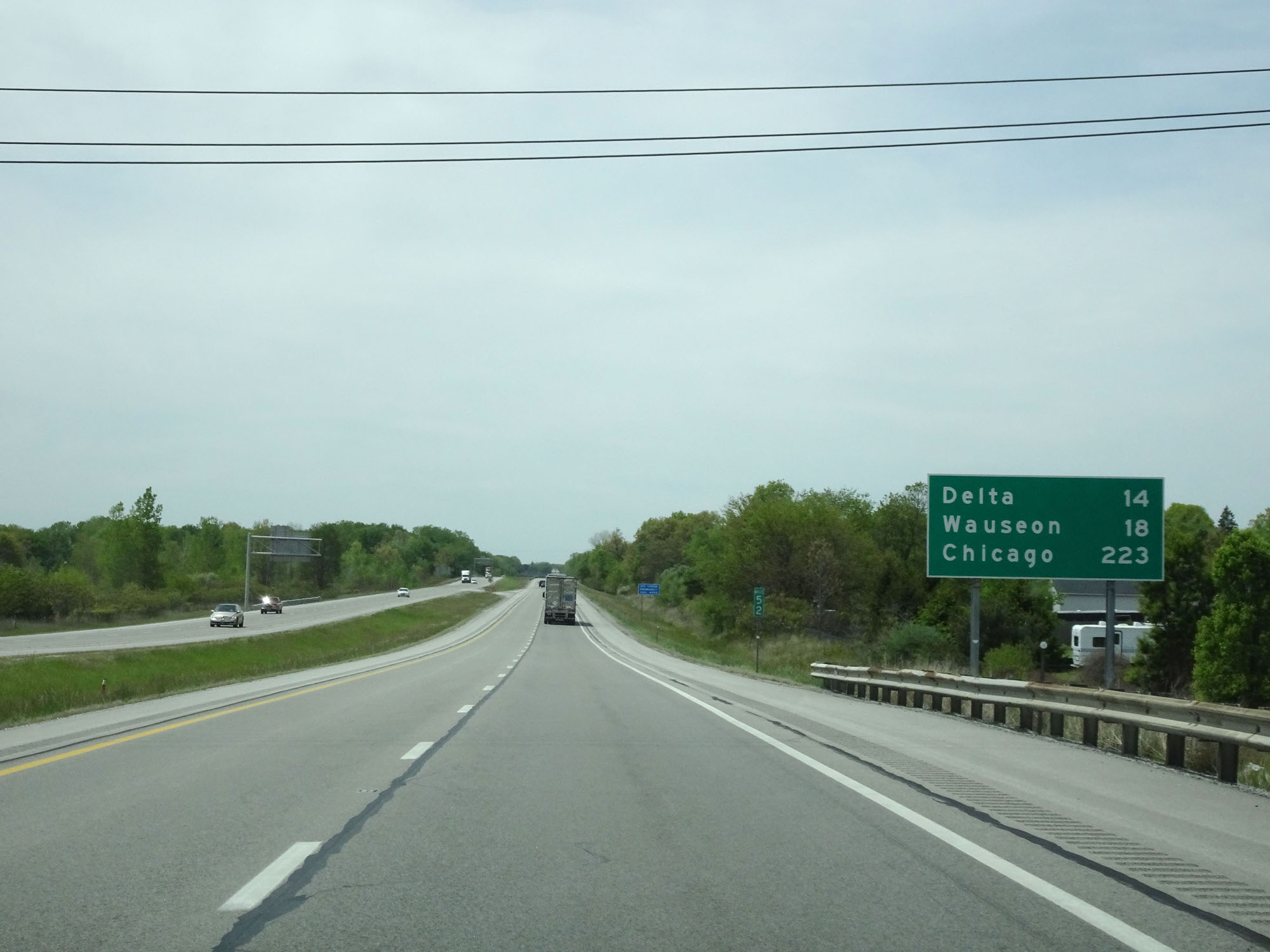 Mileage sign at mile marker 52. It's 14 miles to Delta, 18 miles to Wauseon, and 223 miles to Chicago.  (Photo taken 5/20/16).