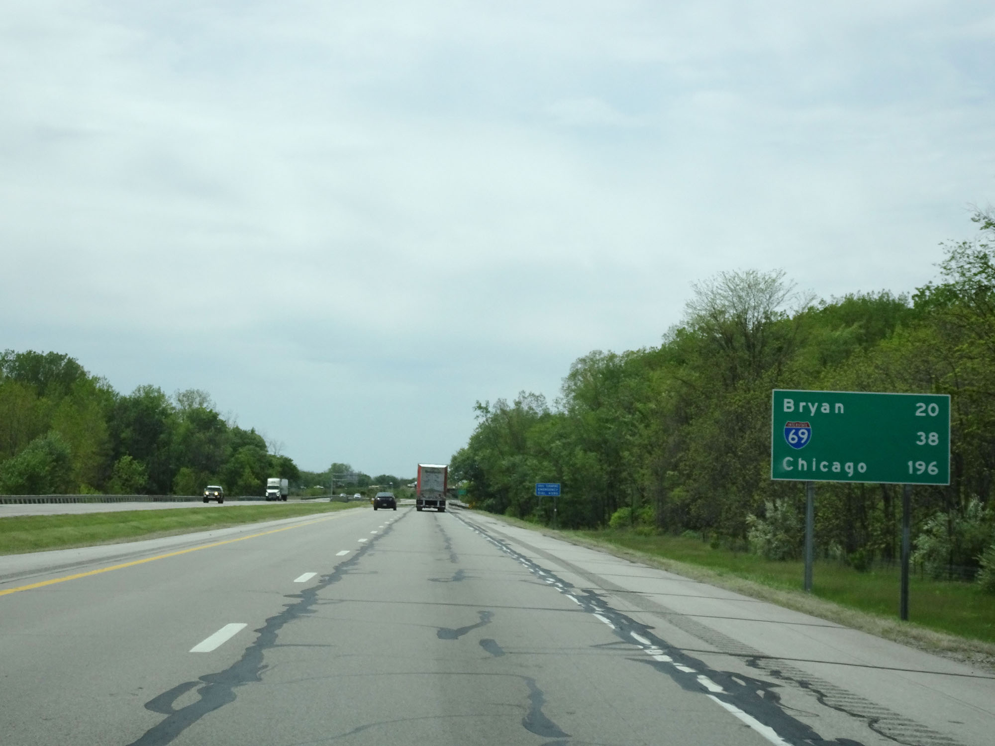 Mileage sign near mile marker 25. It's 20 miles to Bryan, 38 miles to the junction of Interstate 69, and 196 miles to Chicago.  (Photo taken 5/20/16).