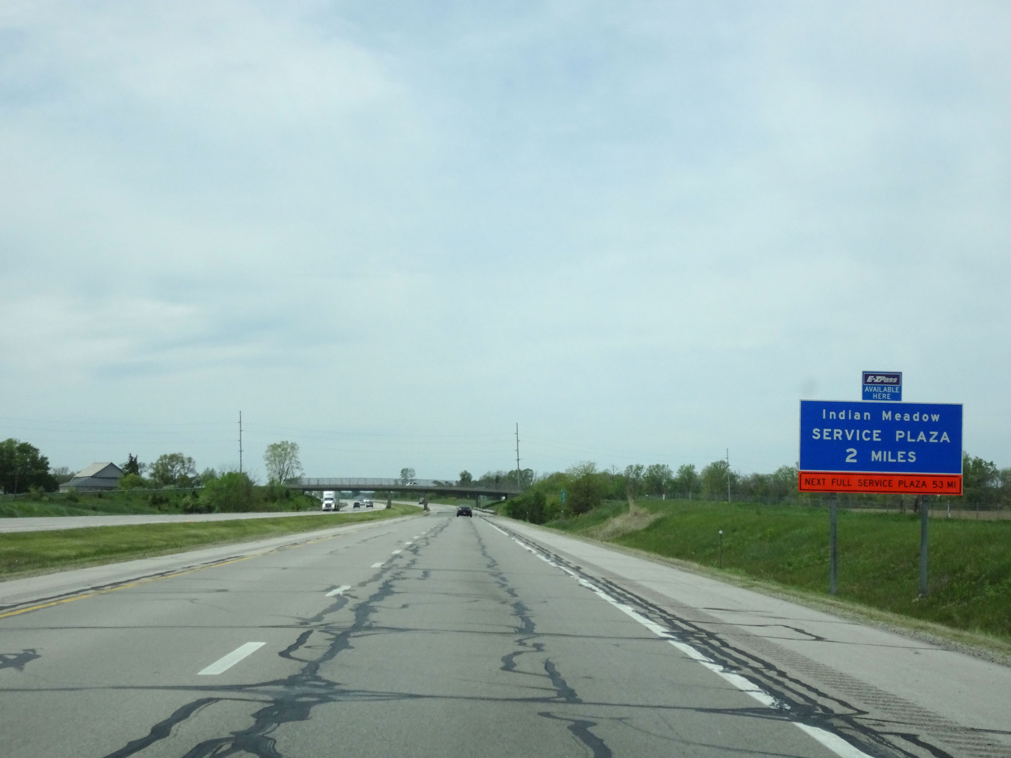 Interstate 80 / Interstate 90 West (Ohio Turnpike) approaching the Indian Meadow Service Plaza - 2 miles.  (Photo taken 5/20/16).