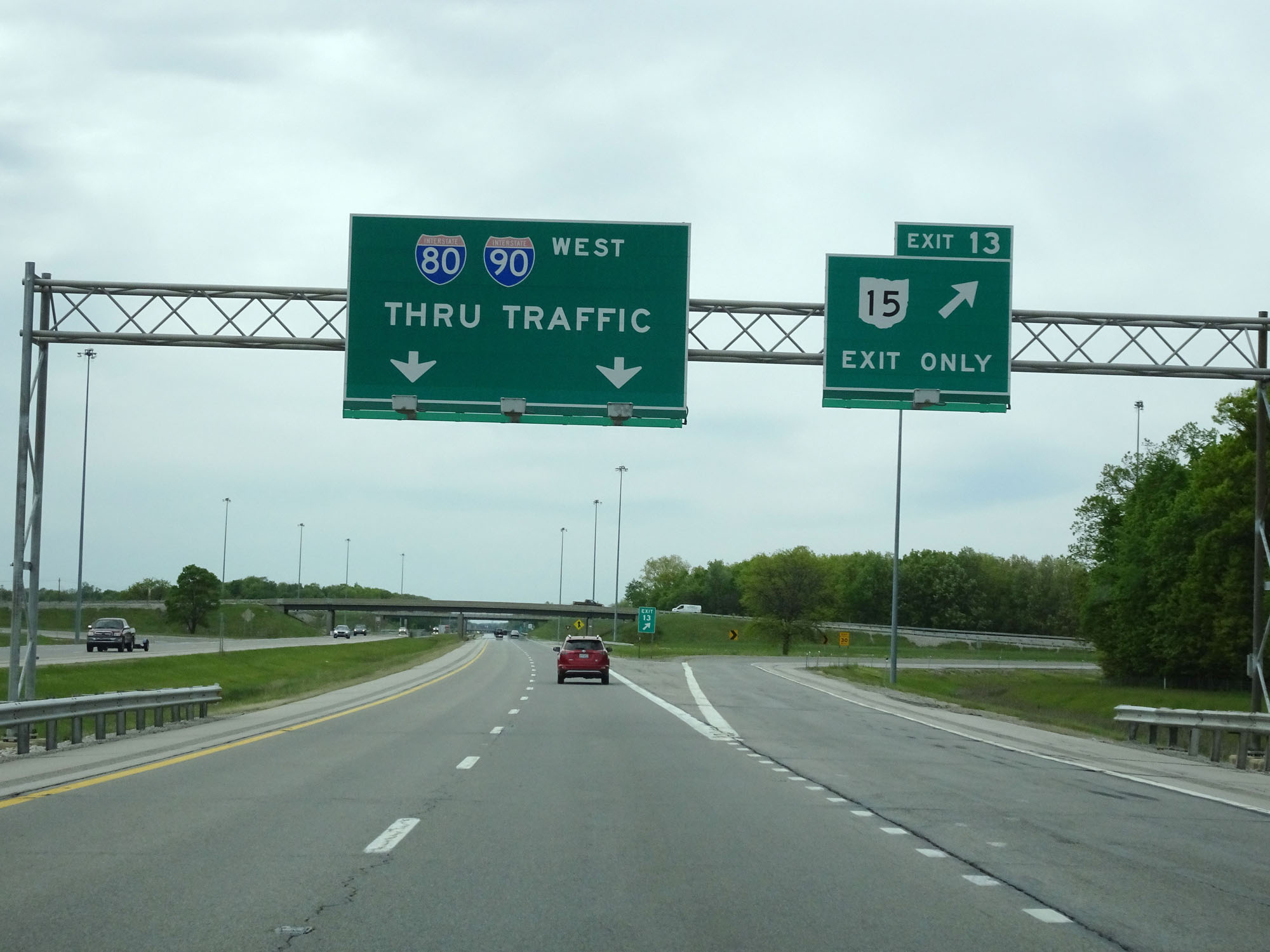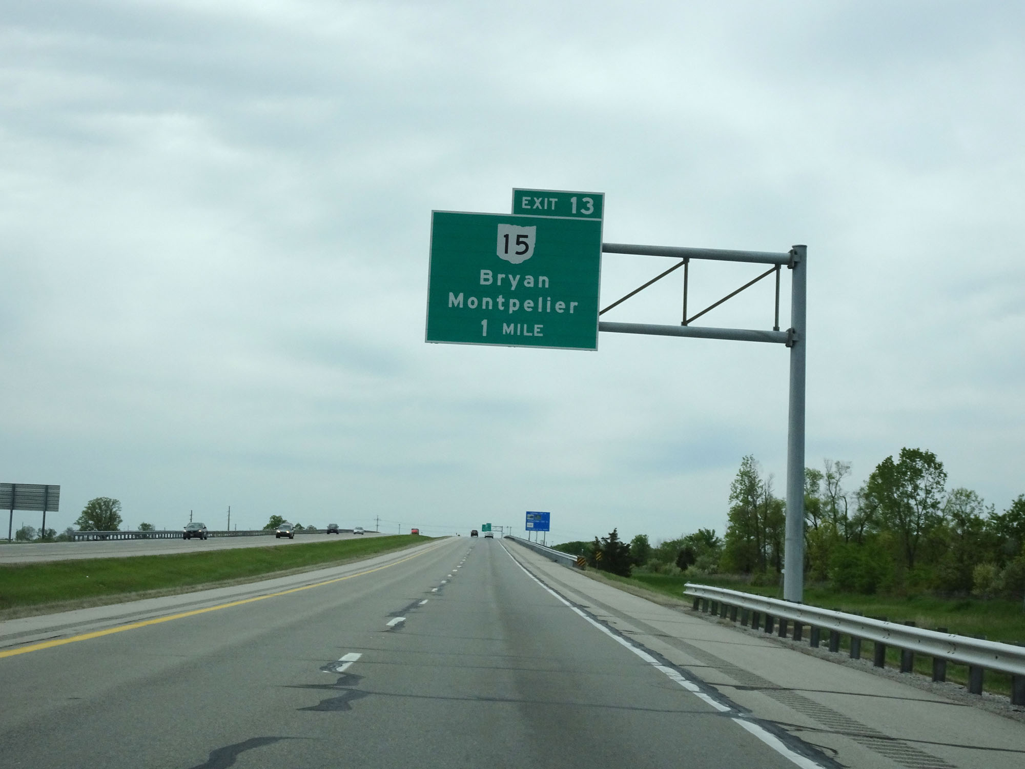 Interstate 80 / Interstate 90 West (Ohio Turnpike) at Exit 13: OH 15 - Bryan / Montpelier  (Photo taken 5/20/16).