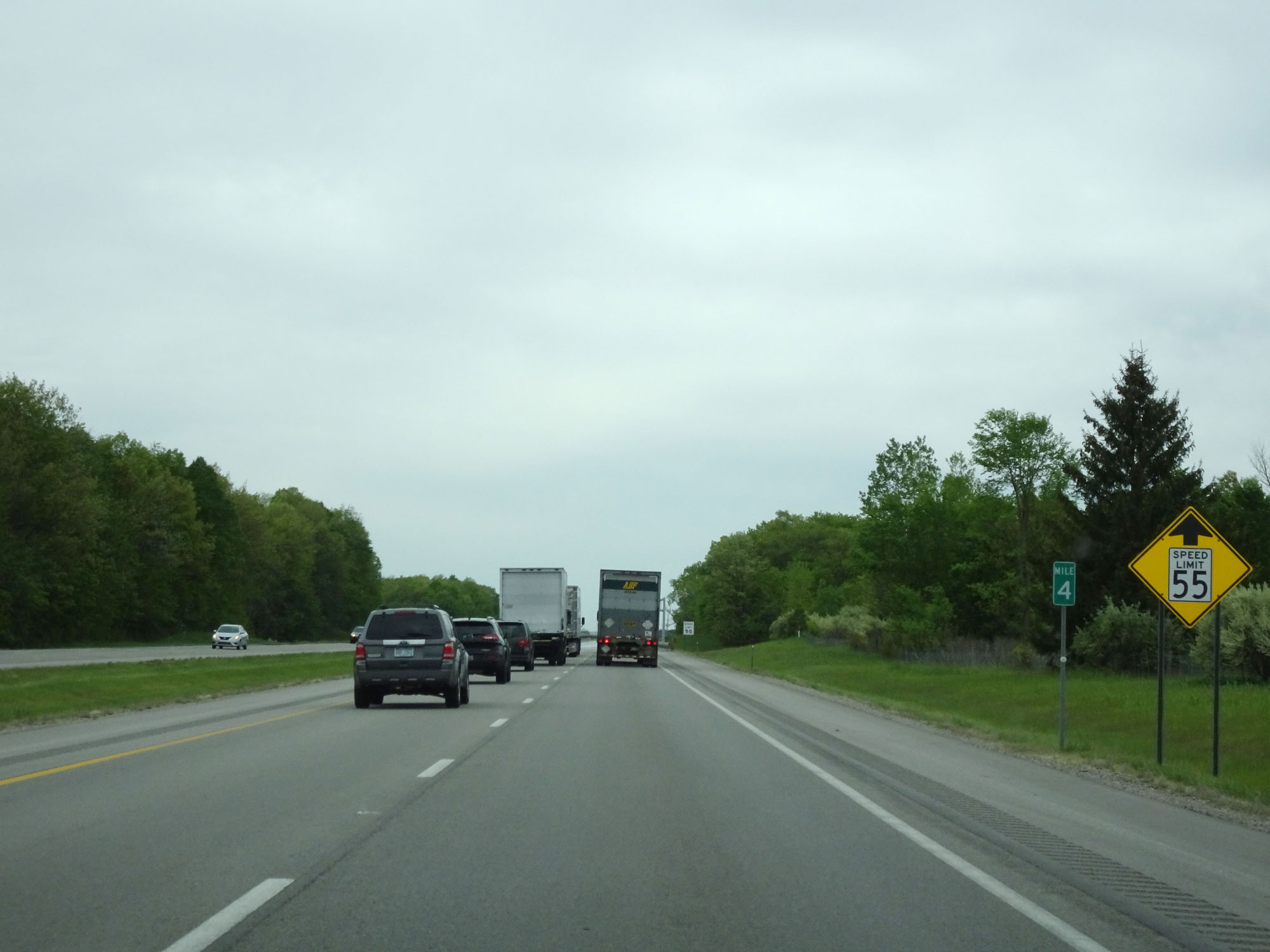 Interstate 80 / Interstate 90 West (Ohio Turnpike) at mile marker 4. The speed limit decreases to 55 mph ahead as we approach the Westgate Toll Plaza.  (Photo taken 5/20/16).