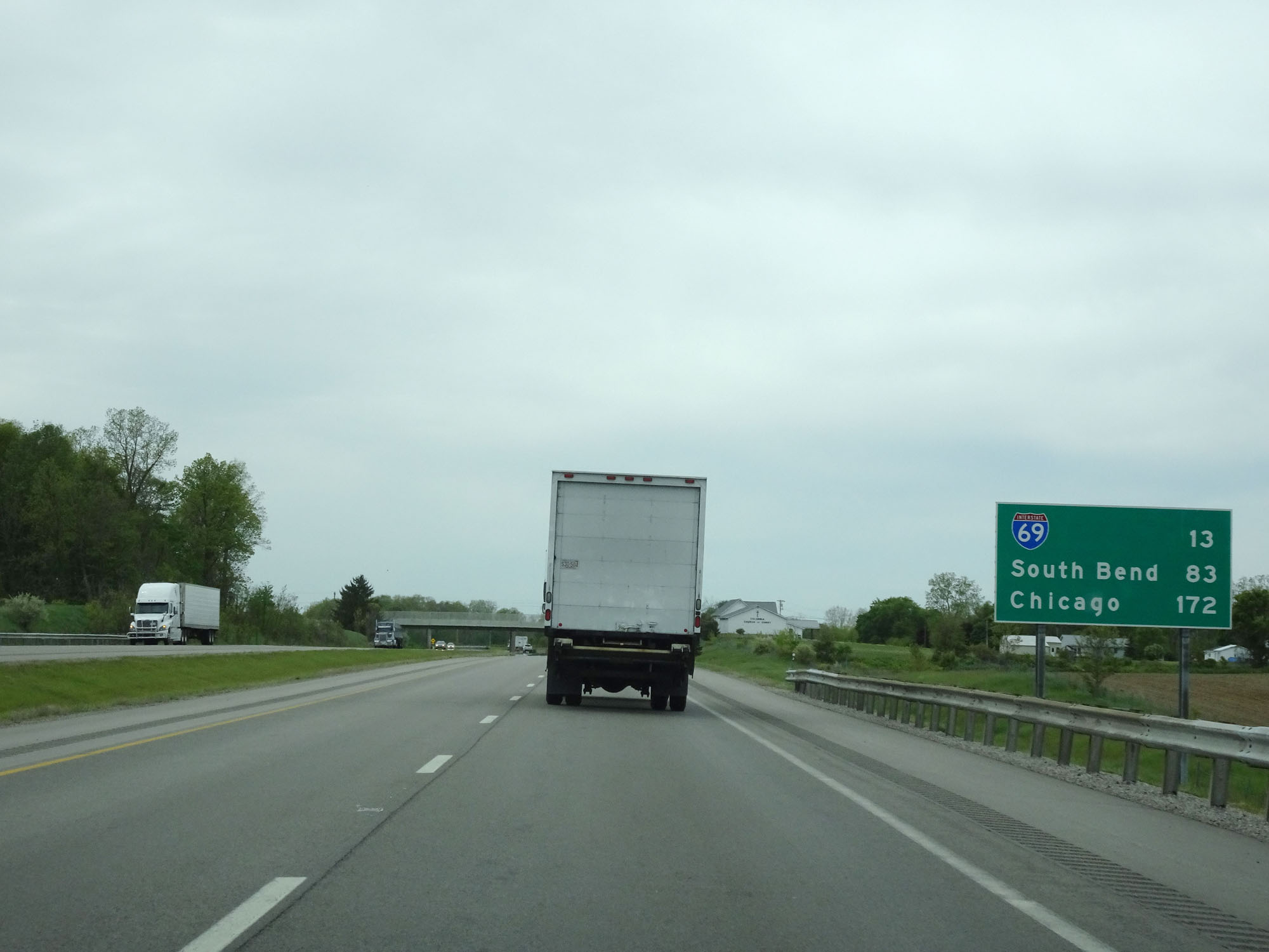 Mileage sign approaching the Indiana border and the beginning of the Indiana Toll Road. It's 13 miles to the junction of Interstate 69, 83 miles to South Bend, and 172 miles to Chicago.  (Photo taken 5/20/16).
