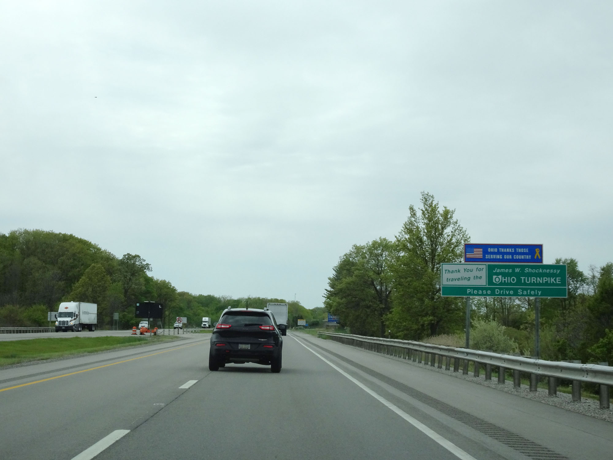 Just before the Indiana border and the start of the Indiana Toll Road, this sign thanks you for traveling the James W. Shocknessy Ohio Turnpike.  (Photo taken 5/20/16).