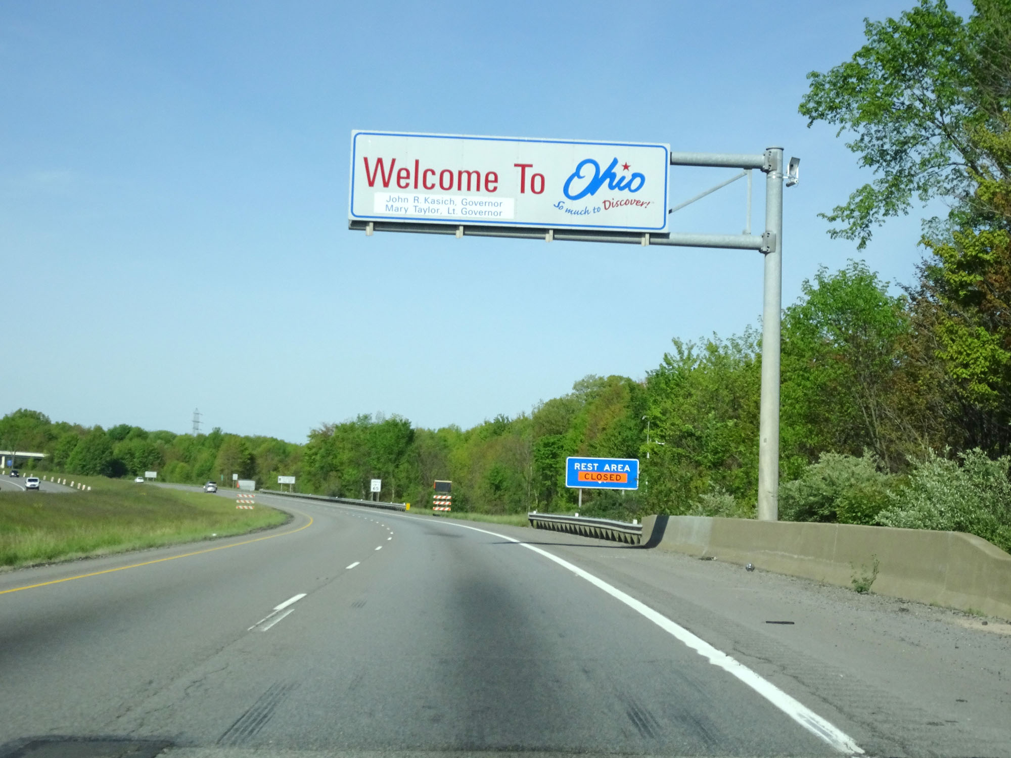 Ohio welcome sign as Interstate 80 West enters the Buckeye State from Pennsylvania.  (Photo taken 5/20/16).