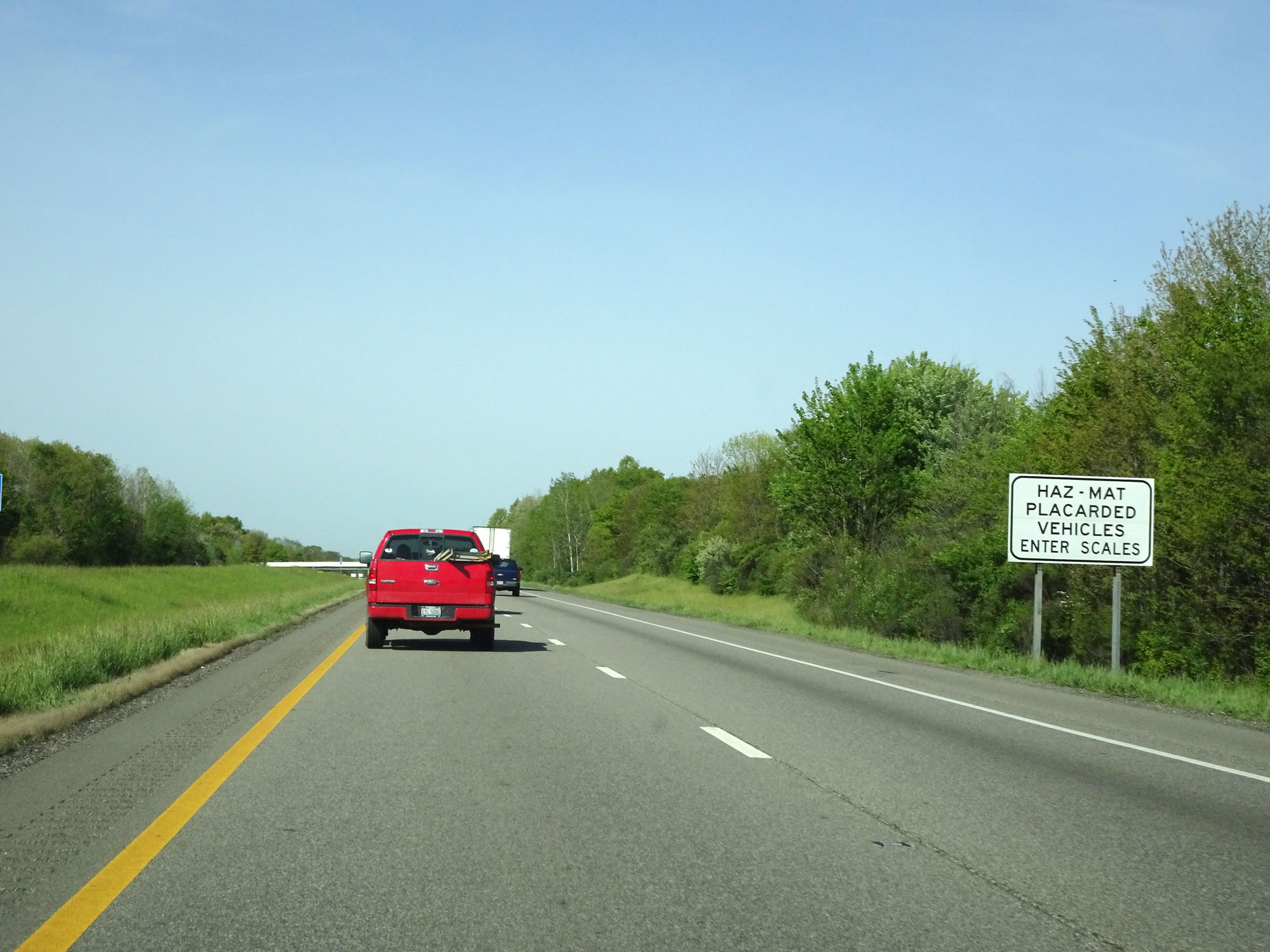 This sign warns that all commercial vehicles hauling hazardous materials requiring placards must enter the scales when they're open.  (Photo taken 5/20/16).
