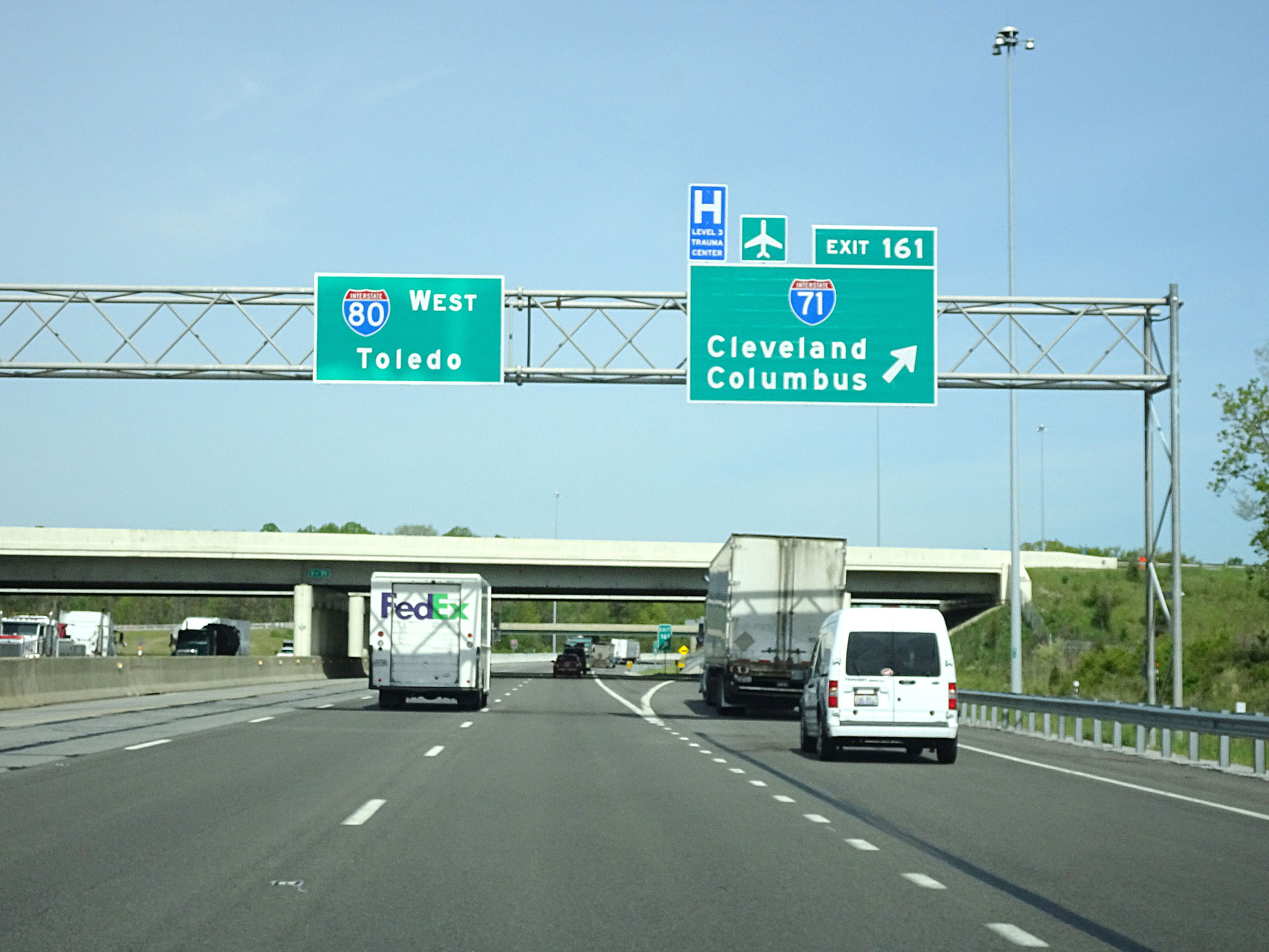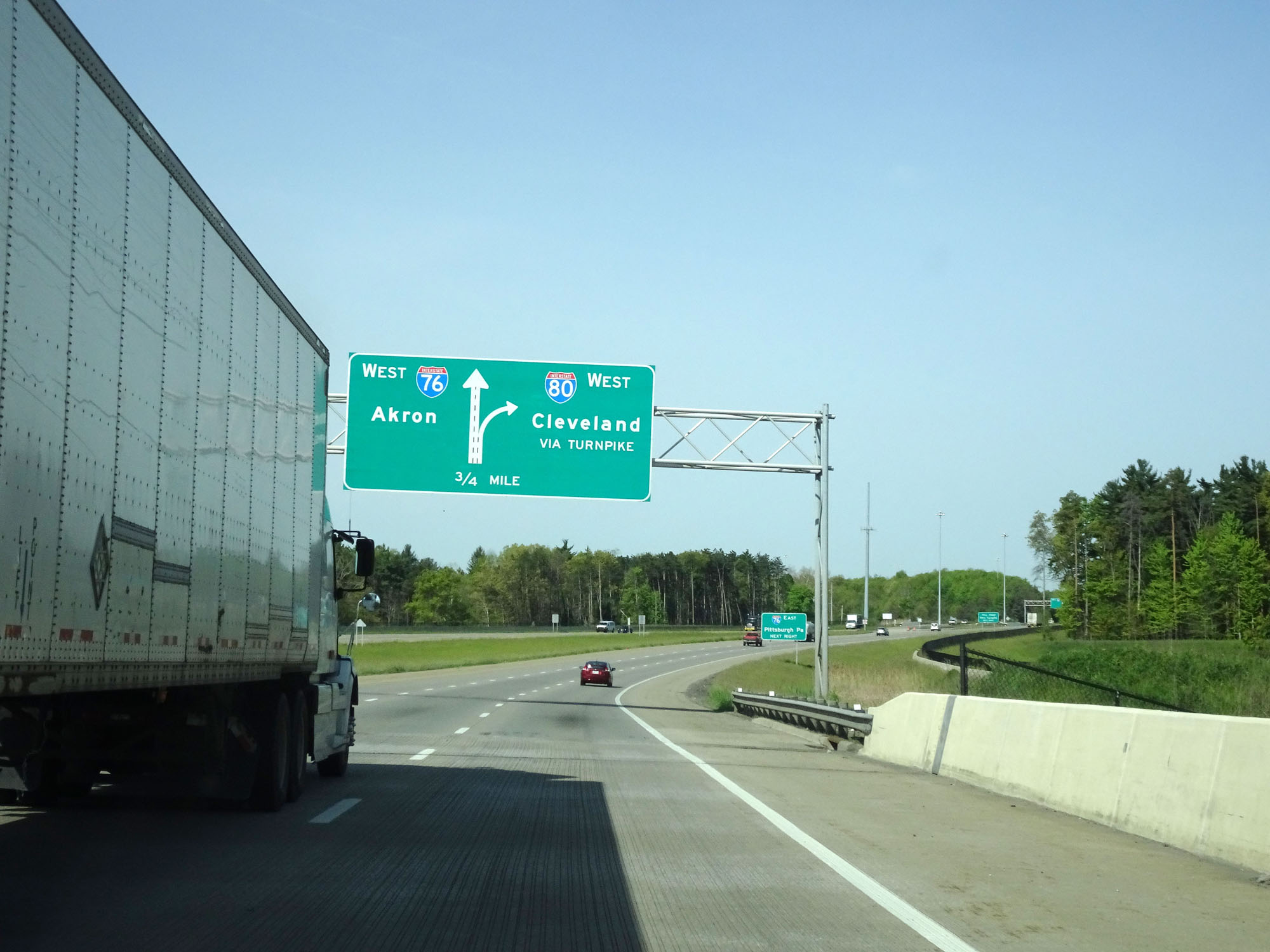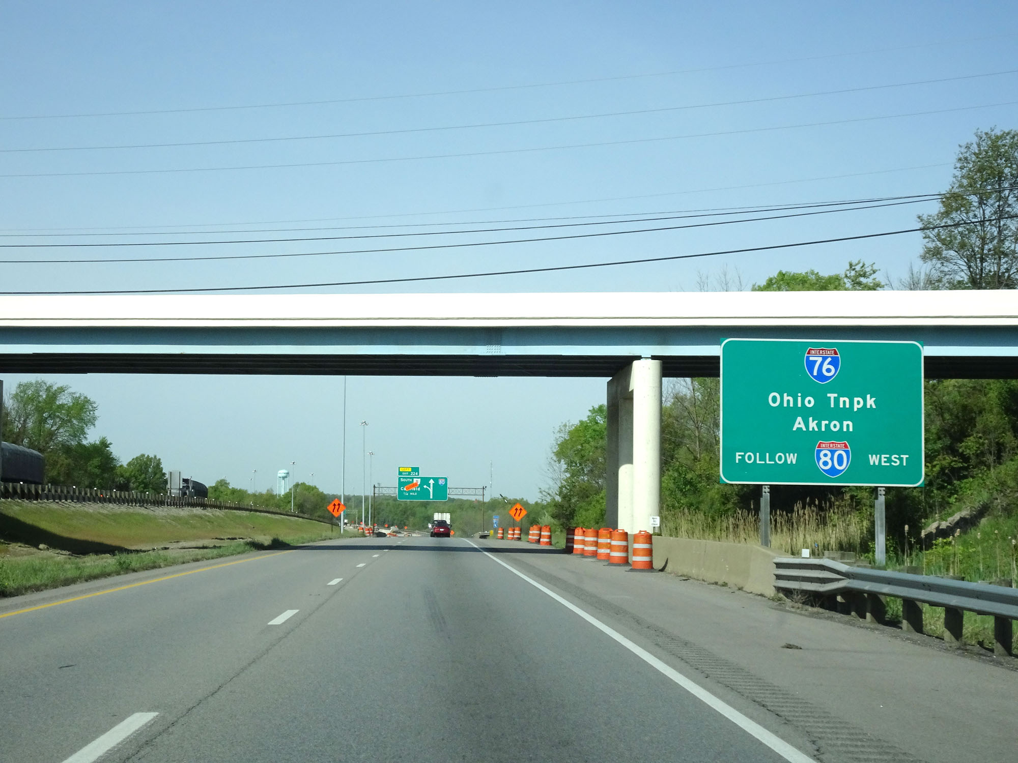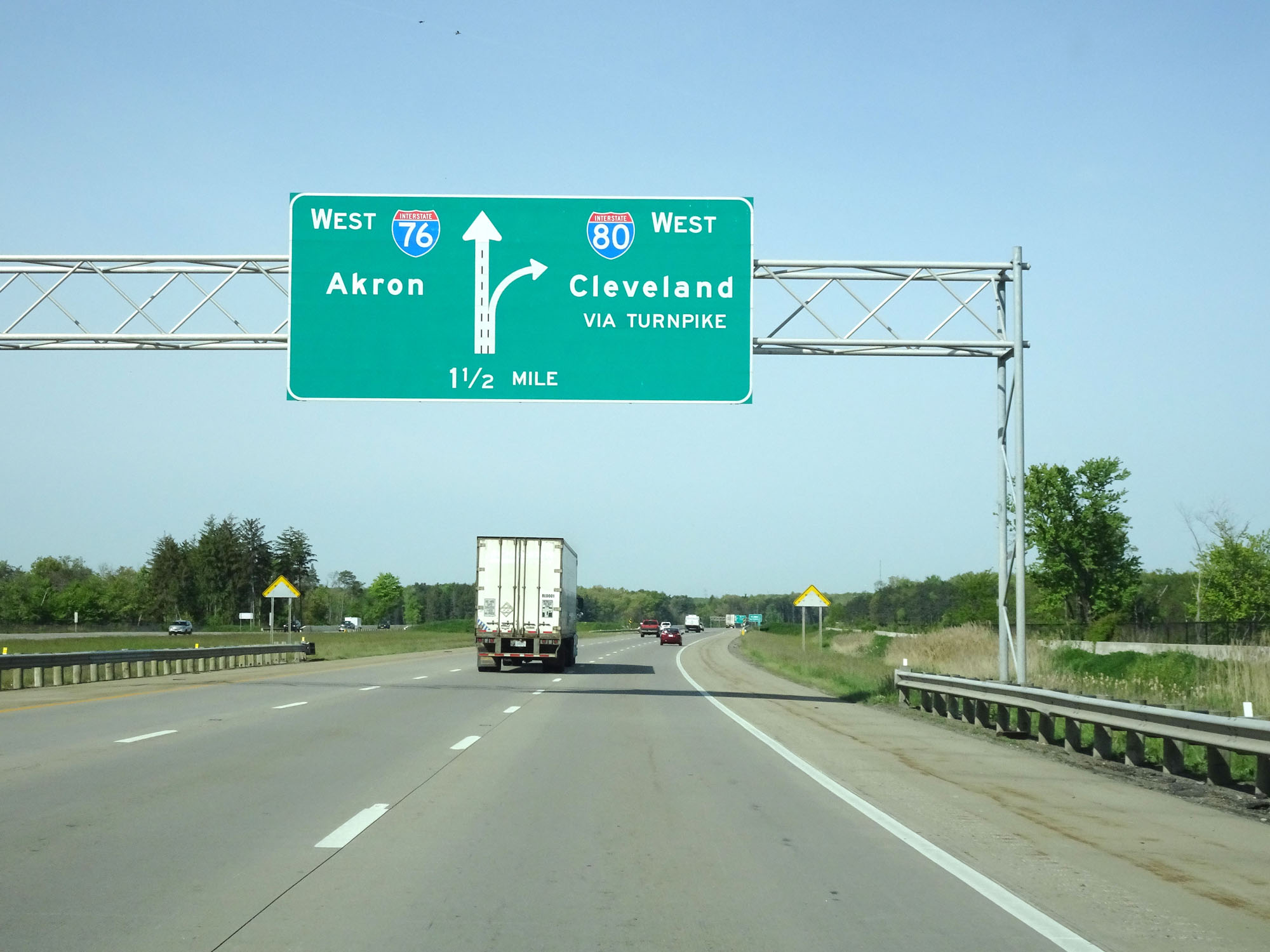 Interstate 80 West at the junction of the Ohio Turnpike. You must exit off to the right here to remain on Interstate 80 West and enter the Ohio Turnpike. Stay to the left to go onto Interstate 76 West toward Akron.  (Photo taken 5/20/16).