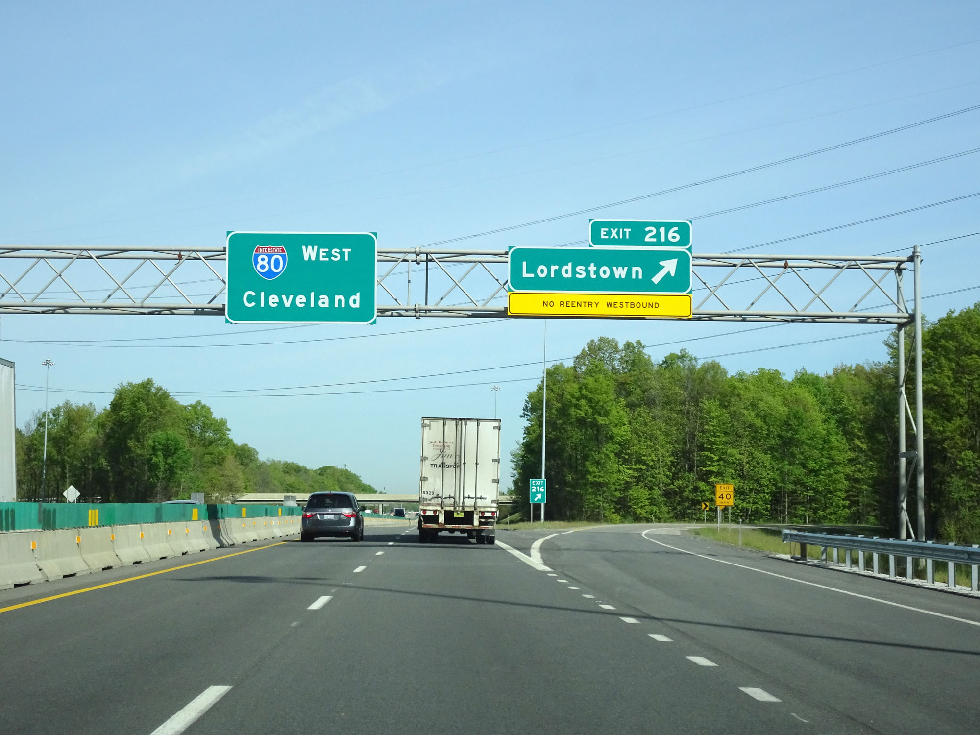 Interstate 80 West (Ohio Turnpike) at Exit 216: Lordstown. As the sign reads, there is no re-entry to I-80 West (Ohio Turnpike) at this exit.  (Photo taken 5/20/16).