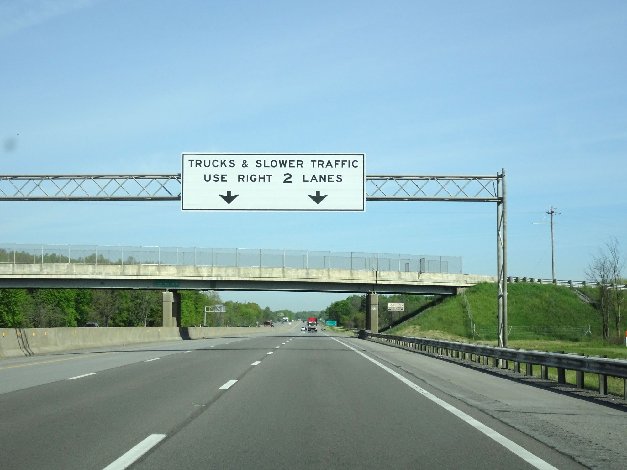 The Ohio Turnpike maintains three lanes in each direction (save for any construction zones) from this point until we're west of the Toledo area. As such, several of these overhead signs exist stating that trucks and slower traffic should use the two rightmost lanes except to pass.  (Photo taken 5/20/16).