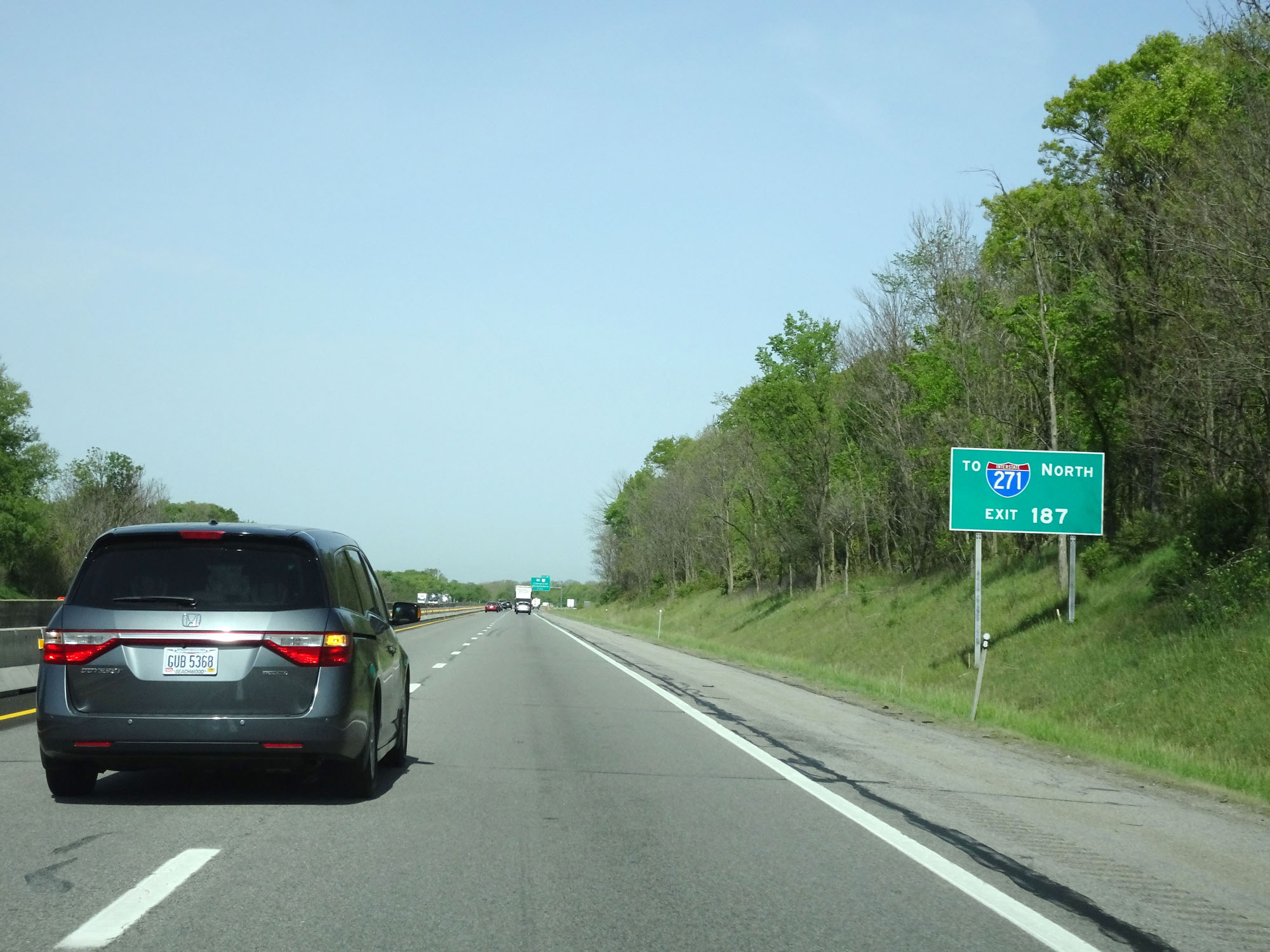 As this sign says, take Exit 187 to access Interstate 271 North. There is no direct interchange between Interstate 80 (Ohio Turnpike) and Interstate 271, which is one of the rare instances where two Interstates cross paths but don't have an interchange with one another.  (Photo taken 5/20/16).