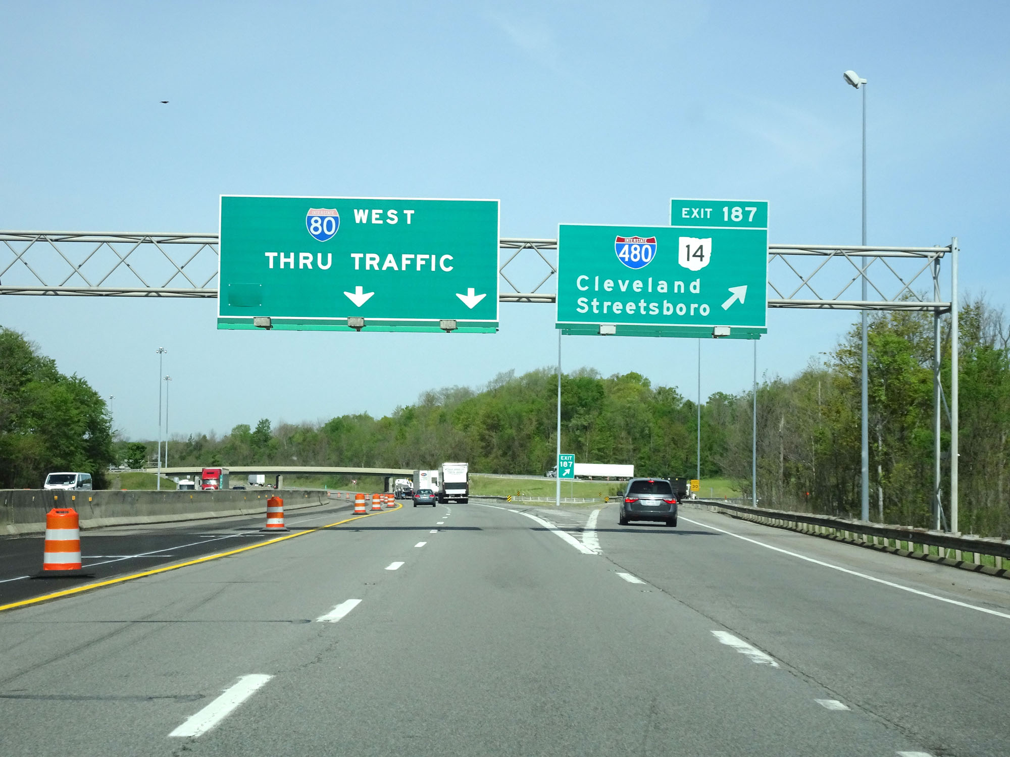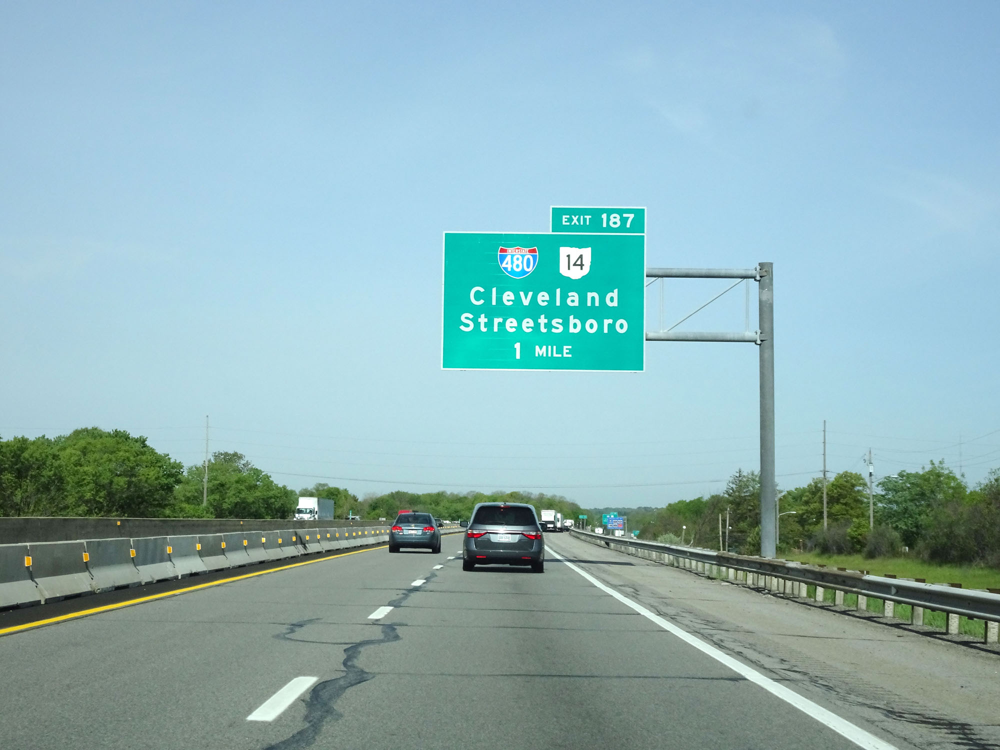 Interstate 80 West (Ohio Turnpike) at Exit 187: Interstate 480 / OH 14 - Cleveland / Streetsboro  (Photo taken 5/20/16).