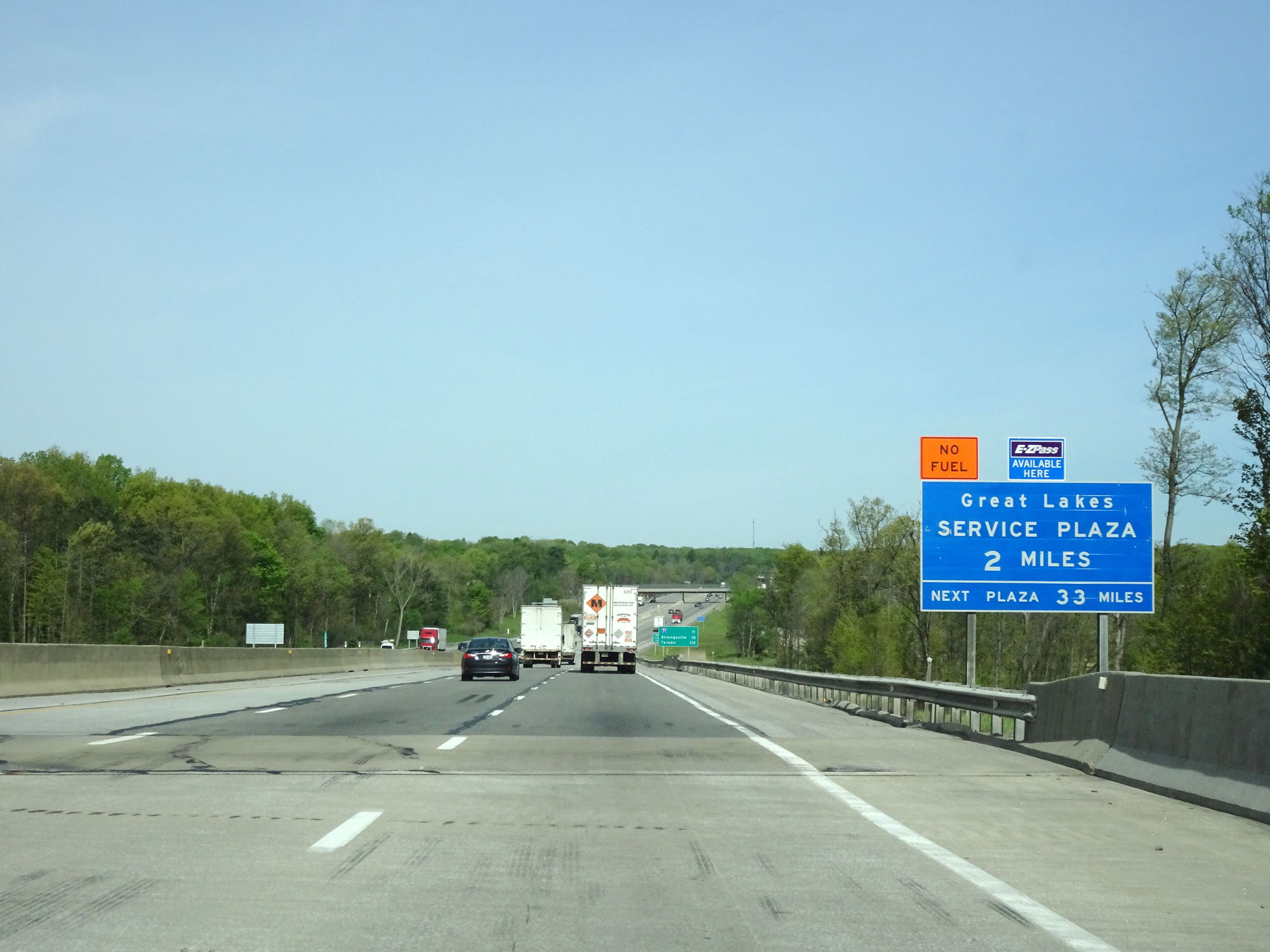 Interstate 80 West (Ohio Turnpike) approaching the Great Lakes Service Plaza - 2 miles.  (Photo taken 5/20/16).