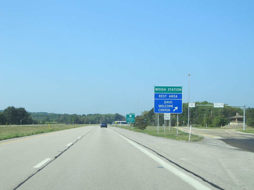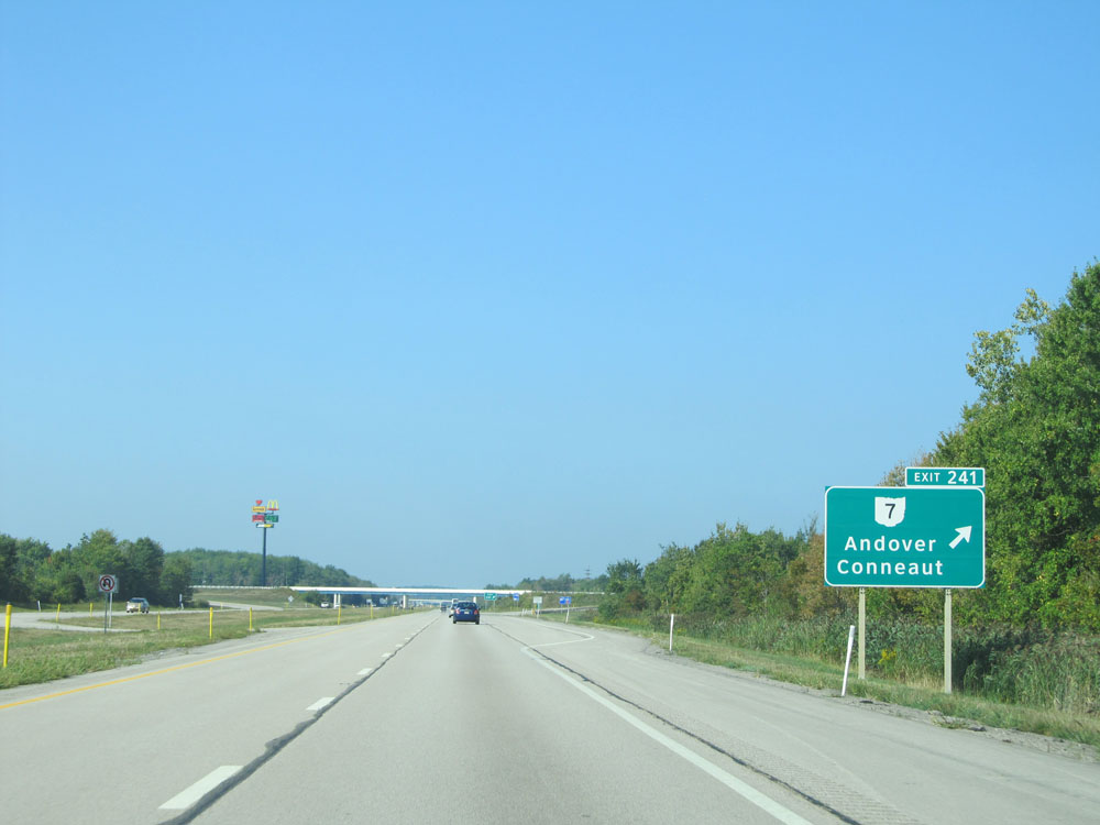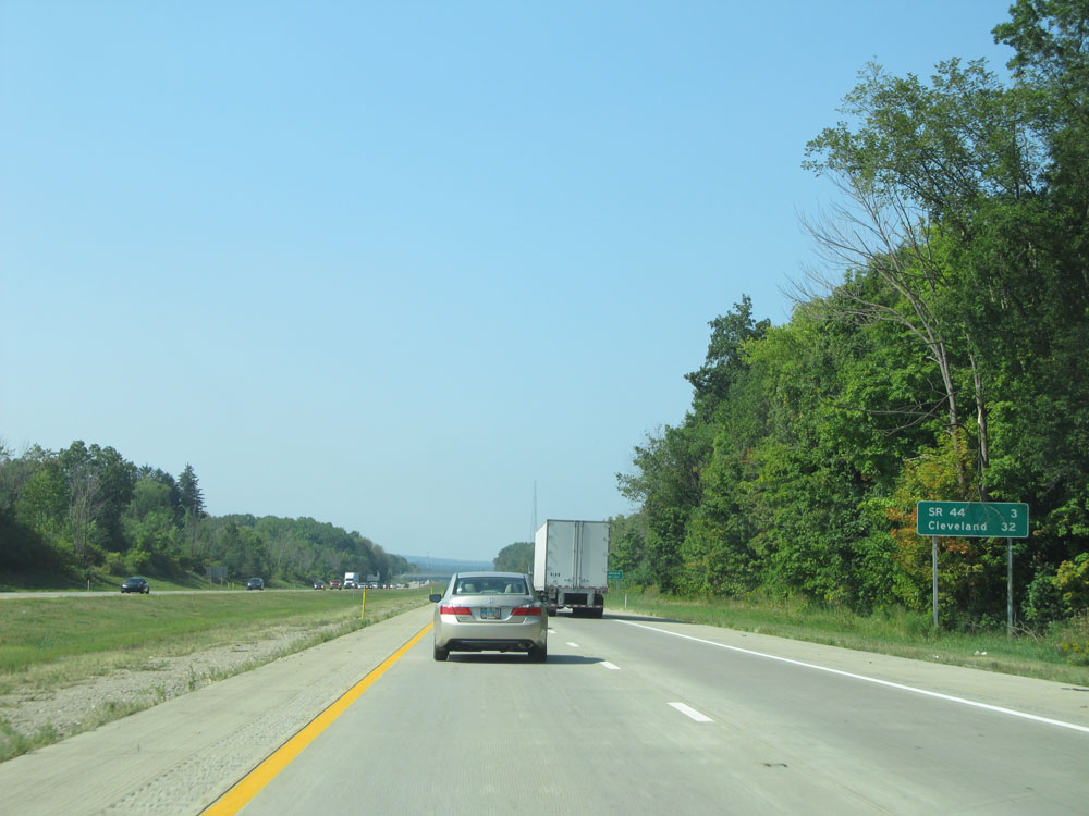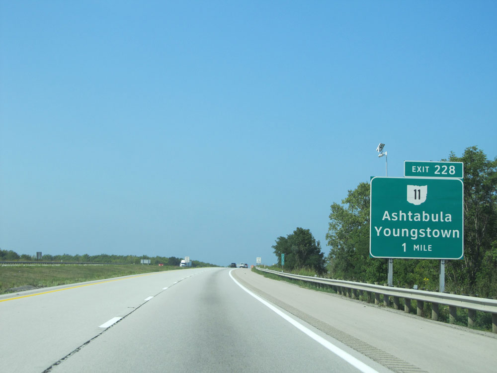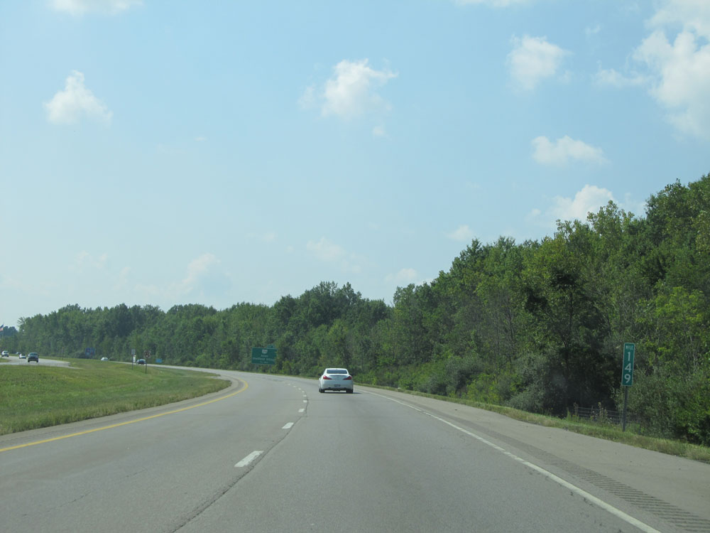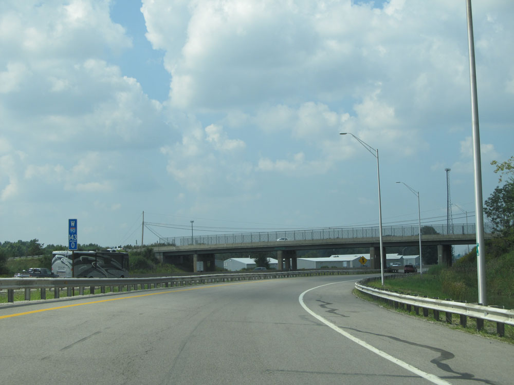At mile marker 143, Interstate 90 West prepares to join up with Interstate 80 West and the Ohio Turnpike, where they will run concurrently to the Indiana border and beyond.