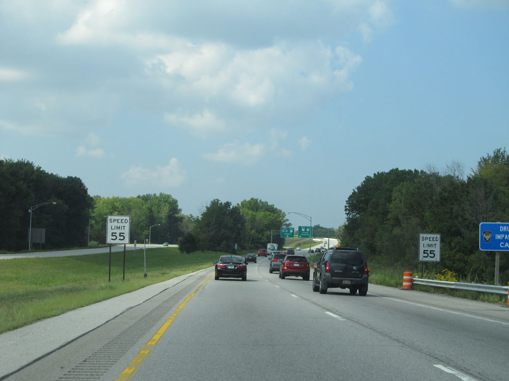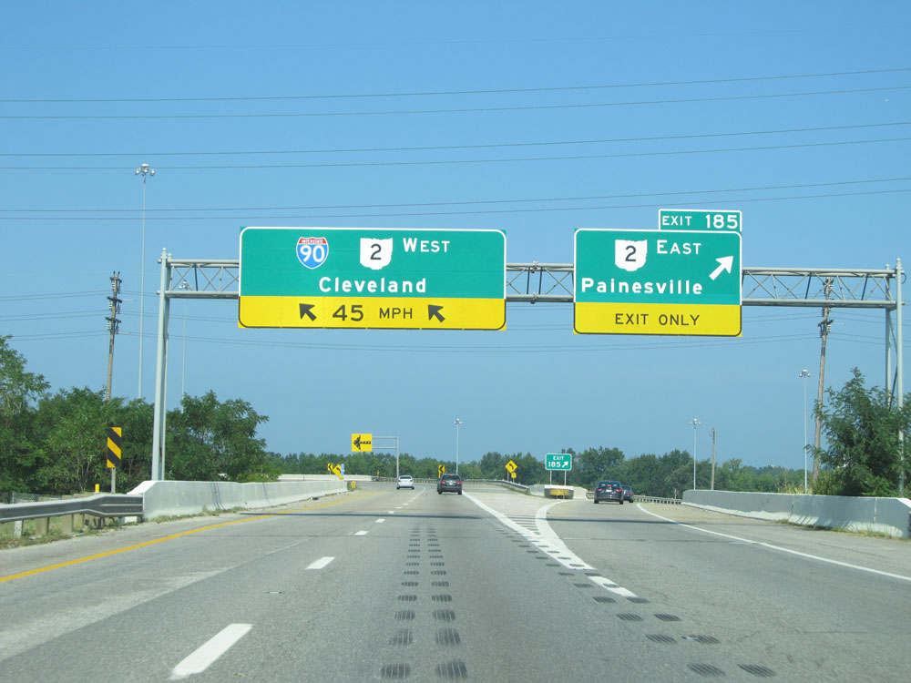 Approaching the split of Interstate 90 and OH 2, the speed limit decreases to 55 mph. (Photo taken 9/6/15).